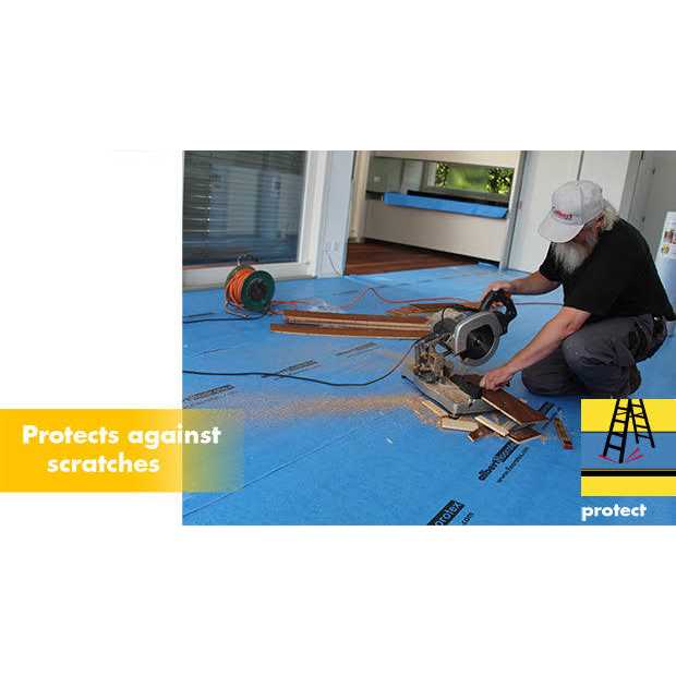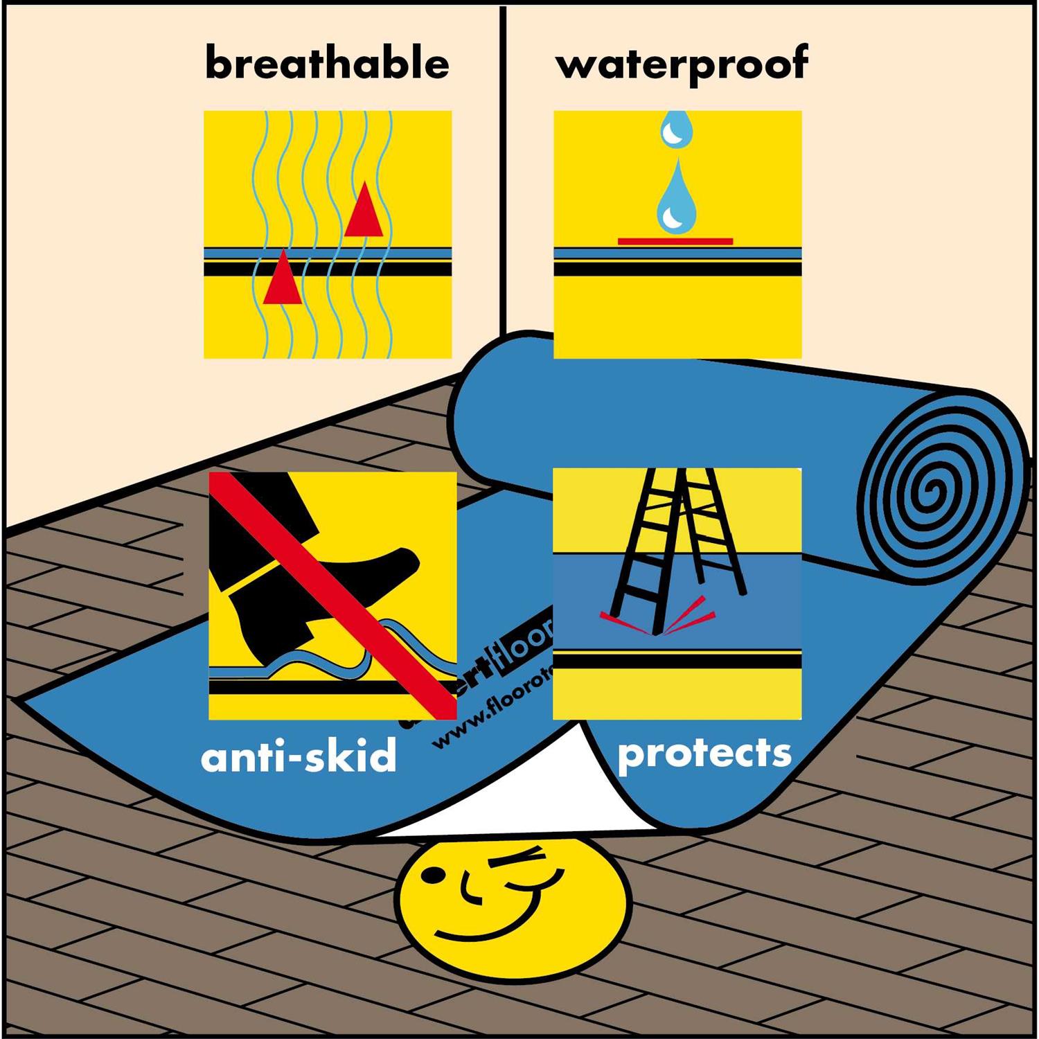 This ultimate construction floor protection is breathable, water proof, durable, and has a residue free anti-slip backing. This thick, light-weight hardwood floor protector has an ultra-light skid and slip-proof adhesive bottom that will not leave a residue on floors. Shield your work area from dirt, moisture and liquids with this protective floor covering product. This waterproof floor cover is reusable, just roll it up and store it until you need it again. The durable construction floor protection is also pressure and scratch resistant, and is virtually tear proof. There are two roll sizes available: 40 inches x 84 feet, and the larger roll size of 40 inches wide by 168 feet long. Floorotex All Purpose Breathable hardwood floor protector allows vapor transmissions for site finished floors. Use All Purpose protective floor covering on hardwood, ceramic, laminate, parquet, as well as other types of flooring. Do not use on newly laid porous stone floors or earthenware slab. Sections of this breathable floor covering can be seamed together with our breathable floor protection tape.