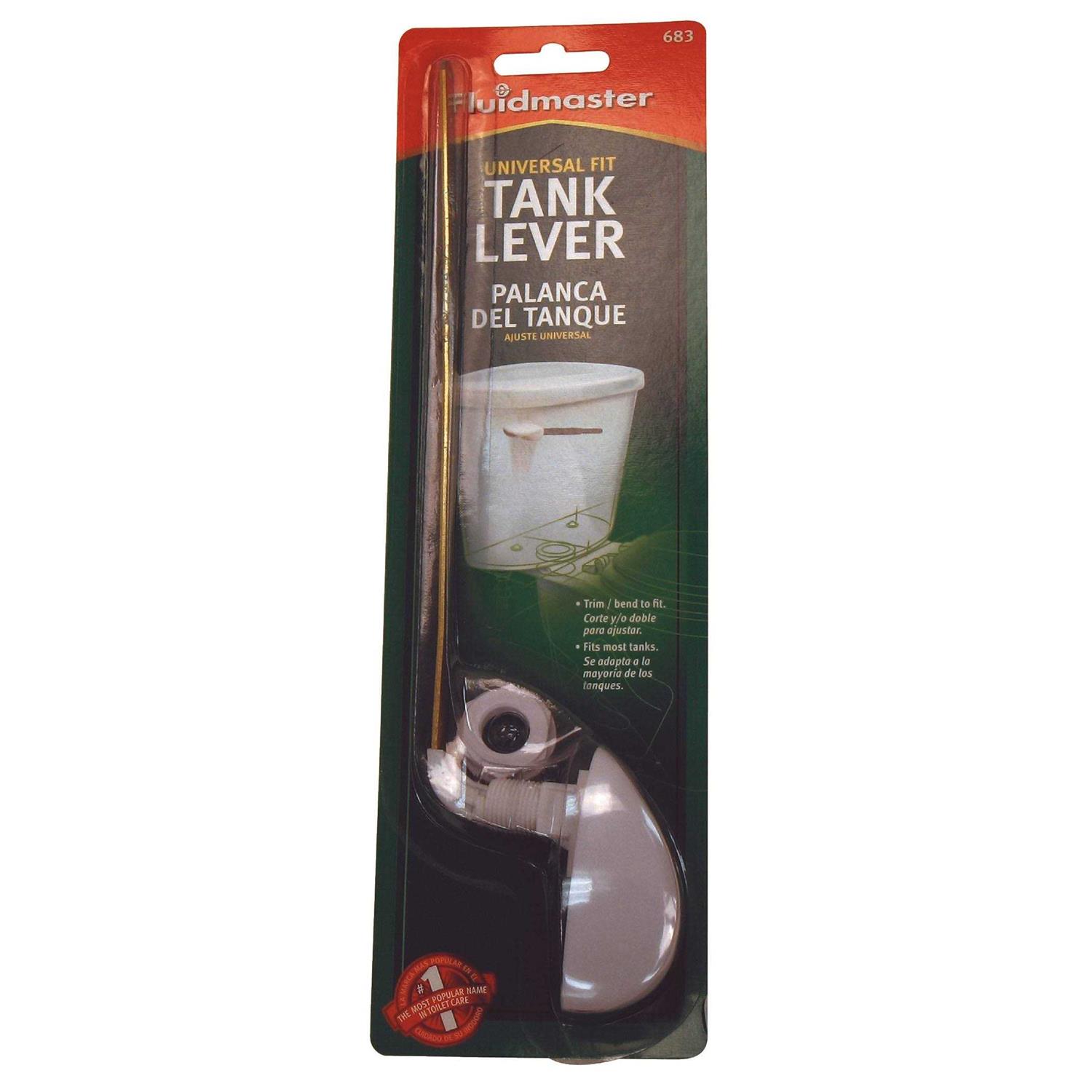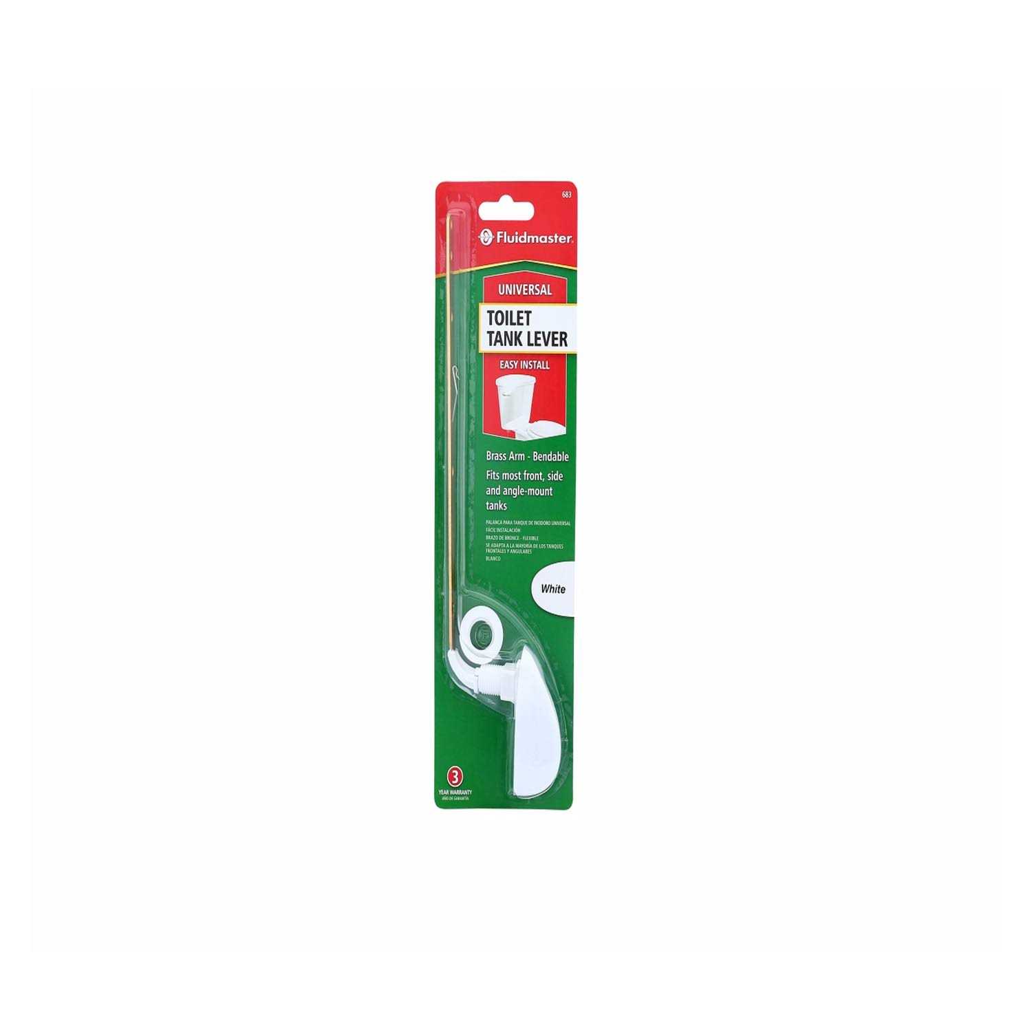 Replace your broken toilet lever fast with this durable and universal design upgrade. Fluidmaster’s 683 Universal Toilet Tank Lever in White is built with quality in mind. Featuring a durable brass arm that can be trimmed, or bent to fit most tanks, and resists corrosion or breaking. The toilet handle is built from high-quality plastic with a chrome finish. The generic style quickly makes your toilet whole again and matches almost any bathroom. The Fluidmaster 683 Universal Tank Lever White with Brass Arm offers a long-lasting solution to replace old, or faulty tank levers.