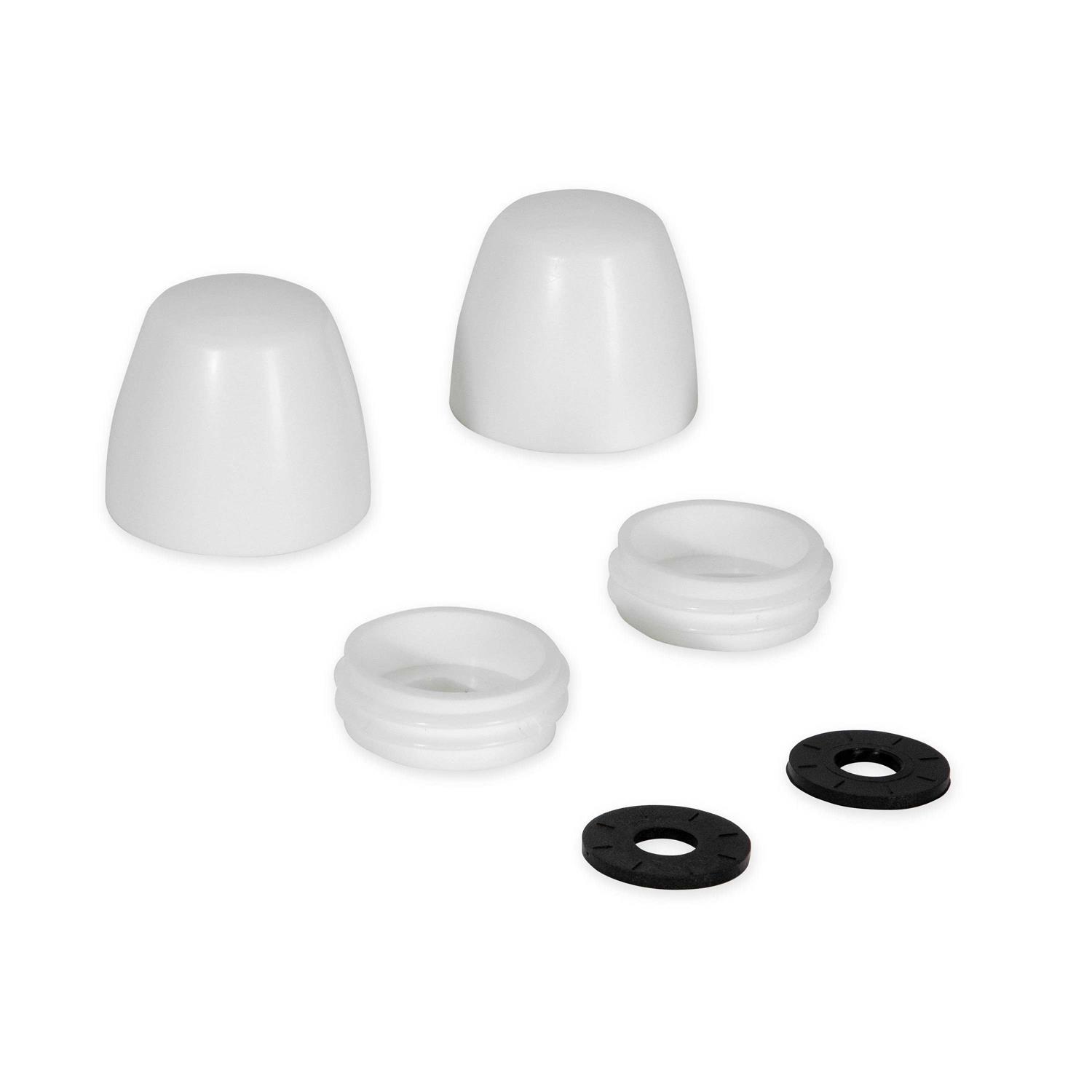 Replace worn-out attachments in your bathroom with this Fluidmaster toilet bolt cap kit. It includes a pair of caps for covering your toilet seat bolts. They have a user-friendly screw-on design that doesn’t require tools for installation and removal. These decorative toiled bolt covers have a white palette to blend in with your toilet seat for a refined look. The universal design of this kit fits a wide variety of toilet seat brands for a wide-range of uses. Each of these plastic toilet bolt caps come with a washer and a threaded cap base to create an airtight seal. The caps have a threaded end that fits snugly on the included cap bases to protect your existing bolt and nut (not included) from rust. The caps, washers and cap bases have a high-quality polypropylene construction, which resists cracks and splits.