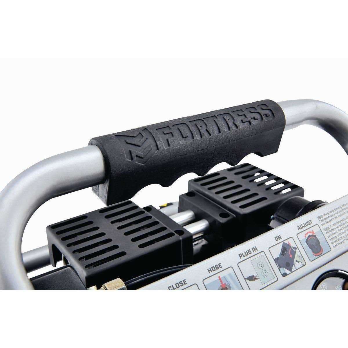 FORTRESS Ultra quiet 57 dBA operation is up to 80% quieter than similar jobsite compressors This Fortress ULTRA QUIET Series Air Compressor is 80% quieter and up to 50% lighter than other compressors in its class. Don’t let the small size fool you- this professional quality air compressor delivers up to 28% more runtime than similar jobsite compressors. The compressor has an integrated control panel with easy-to-read gauges and a built-in quick connect coupler for easy one-handed hose connection.