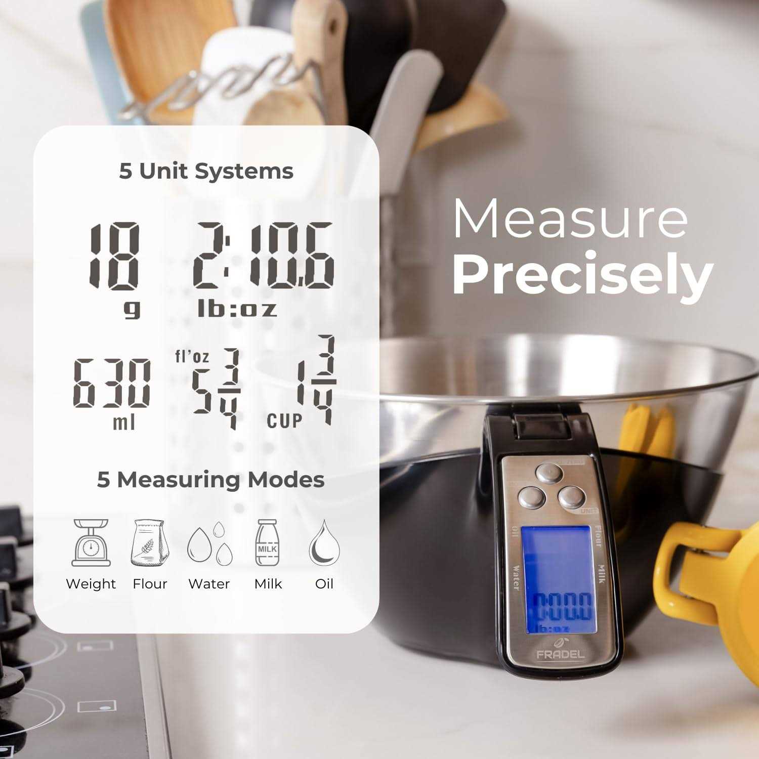 - PRECISE MEASUREMENT: 3 built in measuring modes; grams, milliliters, and cups and has a max capacity of 11lbs/5kgs.