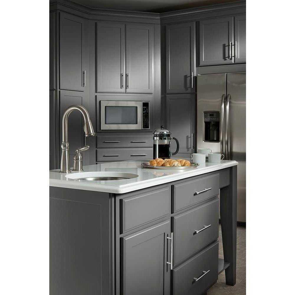 - Classic satin nickel finish coordinates with stainless faucets and appliances.