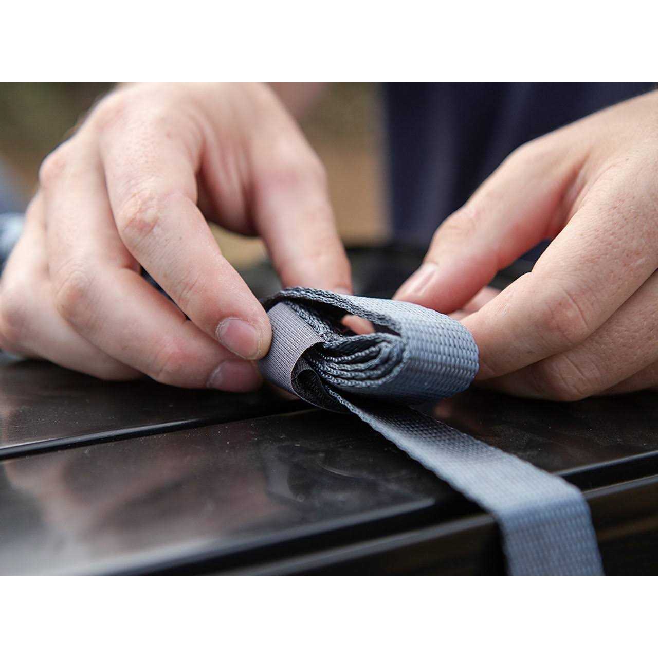 Combination cam buckle-and-bungee tie-down straps let you quickly secure your gear on your platform rack or trailer. Carabiners on both ends of the strap attach to anchor points. Cam buckles let you adjust length and easily snug down your load. Secure your cargo and gear with the more compact Stratchit Shorties. Stratchit Shorties are the ultimate efficient tie-downs with stretchy ratcheting performance in a lightweight, durable strap that is 507mm / 20″ shorter than the regular Stratchit. Keep your rack clean and organized with the cinching hook and loop strap that neatly stows away excess strap length. Replace all of your cumbersome ratchet straps and stop wrestling with fixed length bungee cords. Stratchit Shorties have all the benefits of a compact ratchet strap and bungee cord combined. The weight of the secured cargo must not exceed the combined WLL of the straps being used. For example, if you are using straps with a WLL of 500 lbs each to tie down a load weighing 1,000 lbs, then you need at least 2 straps to safely secure that load.