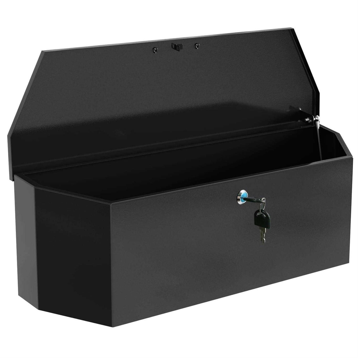 HEAVY DUTY TRAILER TOOL BOX: Keep your trailer organized and your equipment safe with the trailer tongue box! Made from durable carbon steel and coated in sleek black finish, this trailer tool box is built to last. Trailer box rust and corrosion-resistant properties make it the perfect storage solution for all your outdoor gear. AMPLE STORAGE SPACE: Tired of cluttered and disorganized trailers? The trailer tongue tool box offers ample storage space, measuring 35 inches in length, 12 inches in width, and 12 inches in height. The trailer tongue toolbox gives you plenty of room to store all your essential gear from power tools and batteries to camping equipment. TRAILER BOX WITH LOCK: The safety locking of trailer toolbox tongue mechanism ensures that your tools and equipment are safe and secure. Trailer tongue box rugged construction and weather-resistant properties ensure that your equipment stays dry and ready to use when you need it. It is can be used for trailers, trucks, RVs, pickups, flatbed trailers and warehouses. EASY INSTALLATION: The trailer tongue toolbox is non-slip rubber handle ensure a comfortable grip while making it easy to open and close the toolbox. Two U-shaped bolts included in the package, installation is a breeze! QUALITY ASSURANCE: Whether you’re a contractor on the go or an outdoor enthusiast, the trailer tool box is the ultimate storage solution for your trailer.