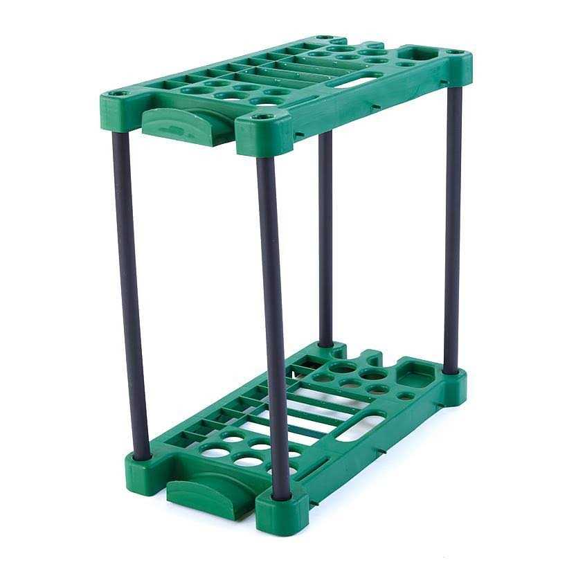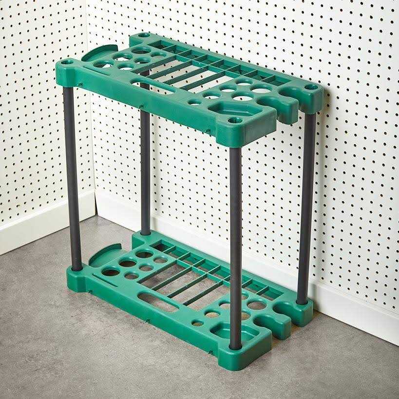 Store your long-handled tools neatly and accessible with this garage storage rack. Features 20 slots to organize brooms, rakes, shovels and more. Also has smaller slots for hand tools and a wrap on the side for a hose or extension cord. Easy assembly required; assembly hardware included.