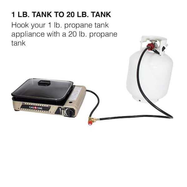 Hose. with adapter fitting lets you hook your 1 lb. propane required propane appliance with 20 lbs. tank or lager by connecting this adaptor. Allows connection to more fuel. This will convert the 1 lb. adapter to a 20 lbs. type fitting and will immediately start saving you money, space and time.