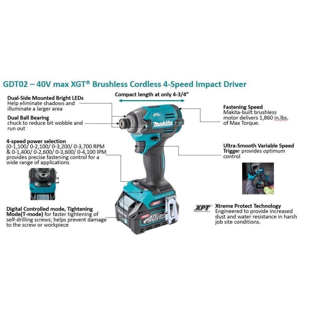 The 40V max XGT Brushless Cordless 4-Speed Impact Driver (GDT02D) breaks new ground for the most demanding driving applications in wood, masonry and metal. The 4-Speed Impact Driver features a digitally controlled Tightening Mode (T-mode) for faster tightening of self-drilling screws which helps prevent damage to the screw or workpiece.It is powered by a Makita-built brushless motor that delivers 1,860 in.lbs. of Max Torque, outpowering other impact drivers in heavy-load applications. An ultra-smooth variable speed trigger provides optimum control. Users get 4 speed settings (0-1,100/ 0-2,100/ 0-3,200/ 0-3,700 RPM and 0-1,400/ 0-2,600/ 0-3,600/ 0-4,100 IPM). This impact driver is a workhorse tool engineered to outlast with Extreme Protection Technology (XPT) to provide increased dust and water resistance in harsh jobsite conditions. Reinforced gear housing provides additional durability on the job site.Convenience features include a compact length at only 4-3/4 in. which makes it ideal for working in tight spaces. The GDT02D features a reinforced gear housing engineered for maximum job site durability. It features two LED lights for increased job sight visibility.XGT is a system of equipment, tools, batteries and chargers utilizing 40v max lithium-ion batteries. XGT is engineered to deliver high power to take on high-demand applications, allowing users to completely transition to a cordless job site.