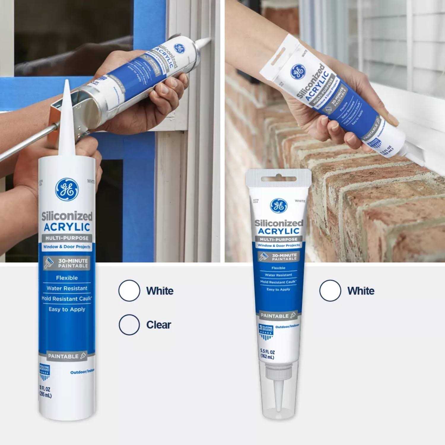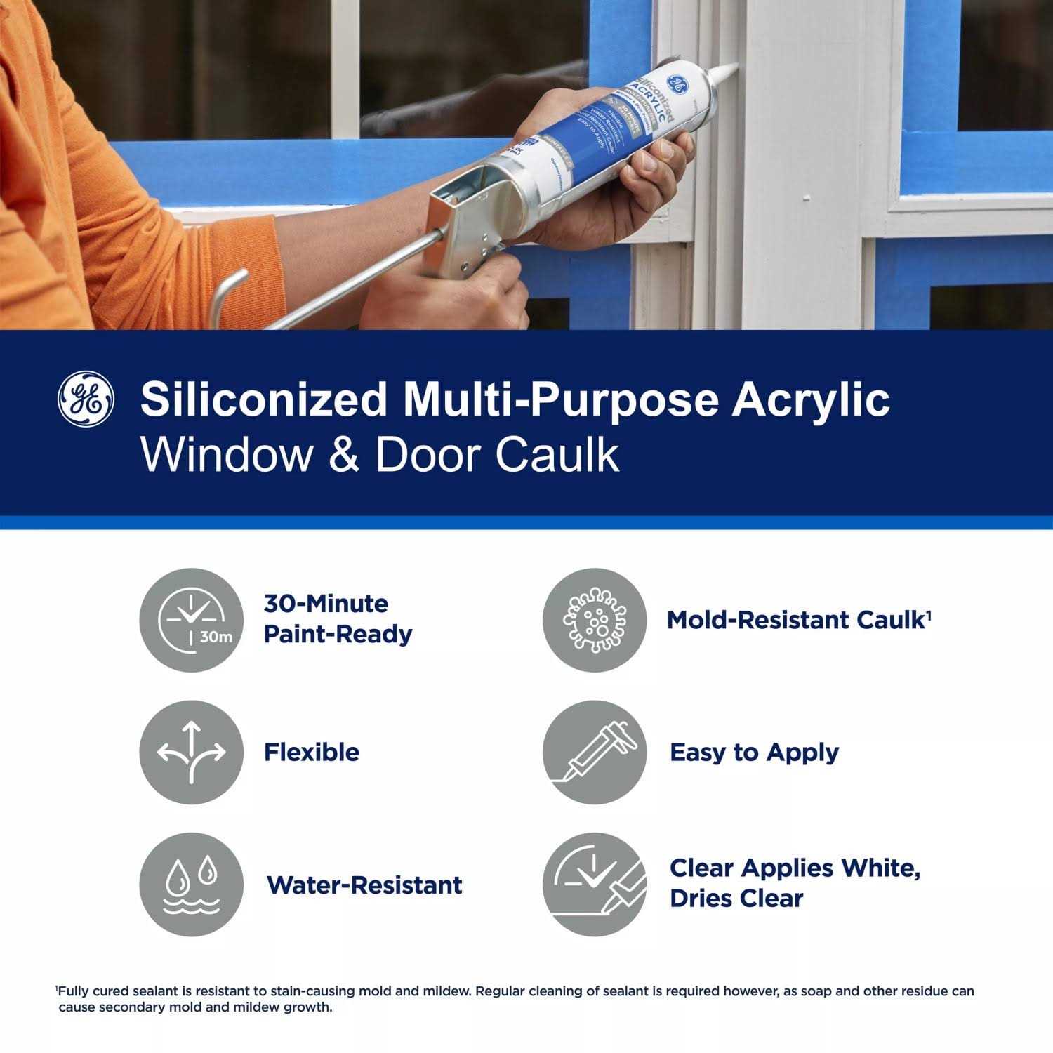 GE Siliconized Multi-Purpose Acrylic Window & Door caulk is a premium, paintable caulk ideal for a variety of outdoor sealing projects, such as sealing windows, doors, trim and more. Thanks to its siliconized formula, this exterior caulk offers improved water resistance and long-term mold resistance, while staying compatible with most latex and oil paints. Seals are ready to paint in as little as 30 minutes and, once fully cured, are flexible and durable enough to resist cracking and withstand frequent cleanings. This window and door caulk guns out effortlessly, tools smoothly and cleans up with soap and water, so you can easily create paint-ready outdoor seals that withstand harsh weather conditions and stay looking great for seasons to come. Product color is Clear. Product comes in a 10 fl oz Cartridge.