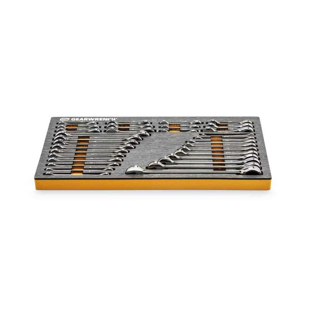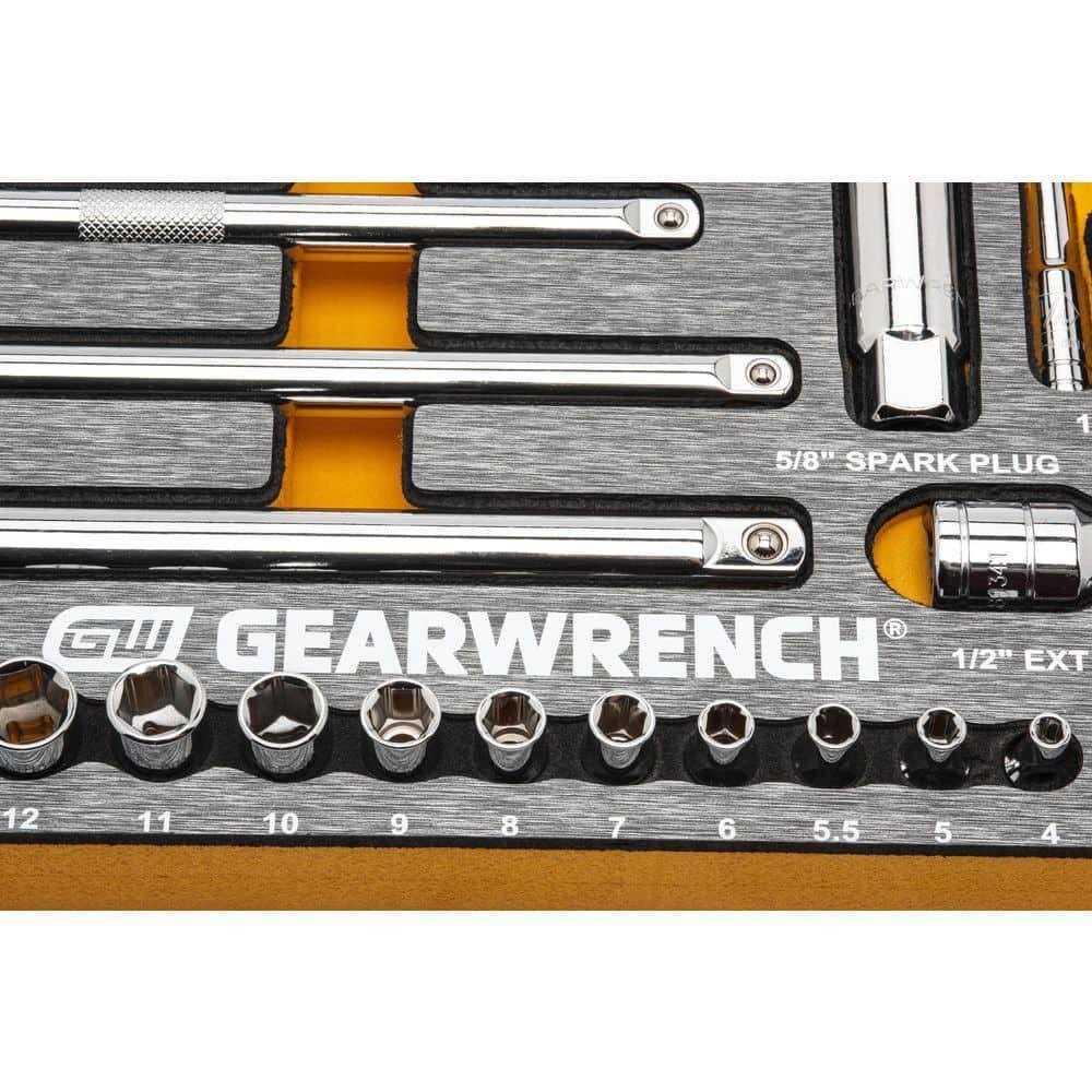 GEARWRENCH is a premier mechanics hand tool brand, offering products that are designed to meet the tough requirements of Professional Mechanics and Automotive Enthusiast. The Metric and SAE Mechanics Hand Tool Set in EVA foam includes a 1/4 in. ratchet, 3/8 in. ratchet and 1/2 in. ratchet that all feature a low profile head and flush mounted reversing lever for greater access. The sockets feature large hard-stamped part numbers and size on both sides of the socket allowing for easier viewing of the socket sizes and double lines (SAE) and knurled lines (metric) for easy SAE versus Metric identification. The wrenches have a 72-tooth ratcheting box end that needs a minimal 5° to move fasteners verse 30° for standard wrenches.