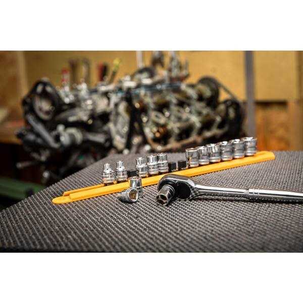 - Easier visibility to socket size. -Packaged in patented slide rail for easier positioning of sockets.