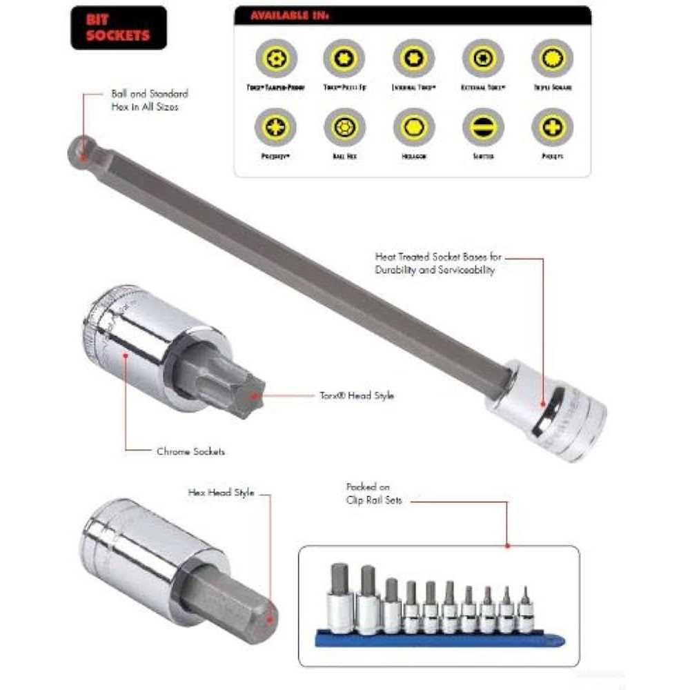 Chrome socket base heat treated for durability and serviceability. Patented bit holding principle features internal dimple which forces bit surface to the opposite side for maximum retention. S2 and alloy steel bits. Size: Metric or SAE.
