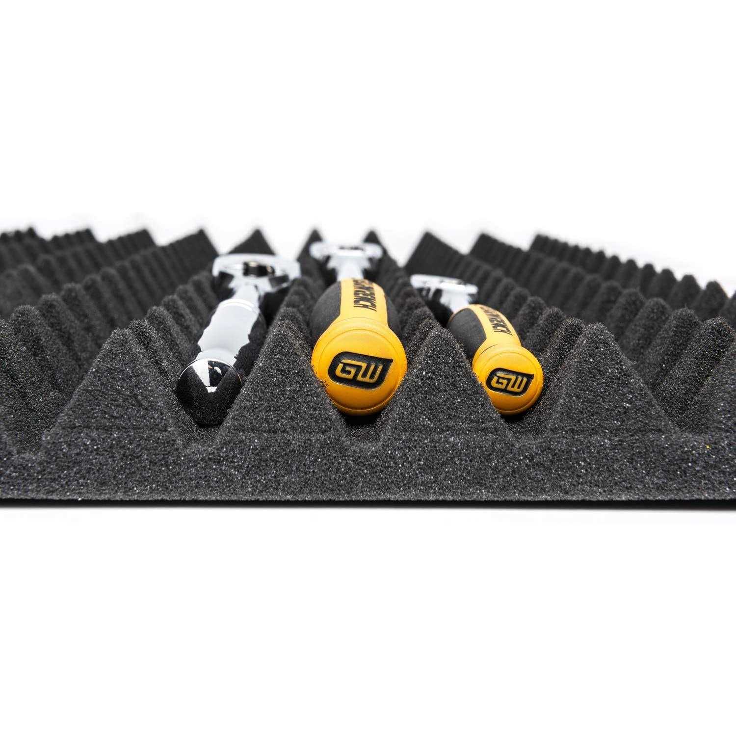 Universal pattern holds most tool shapes Low profile, fits in most tool drawers 2 and above Standard 16 in. x 22 in. can be segmented easy into smaller dimensions Solvent resistant foam material resists tearing Strong enough to stop tools from shifting Quiet mobility for carts that move about The Trap Mat Universal Tool Storage System from GEARWRENCH is customizable and will fit any 2 in. D or deeper drawer. The universal cone design fits almost any shape of tool and the foam is strong and durable to hold your tools in place during transport. The 83370 comes with four 16 in. x 22 in. panels that can be easily segmented to fit smaller drawers.