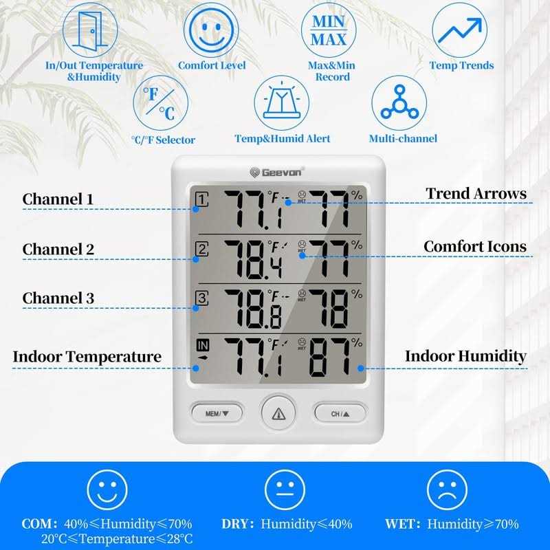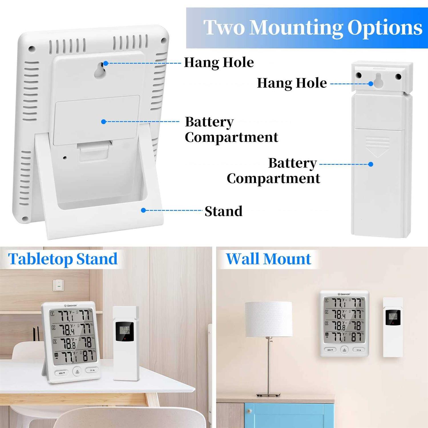 Features: nn–Accurate Temp&Humid Readings Wireless indoor thermometer for home with large LCD display measures the real-time temperature and humidity with past 24 hours Max/Min records and trends arrows. Assess historical data and refer to the Comfort Indicator to quickly know your home living conditions. Works with the hi/lo temperature and humidity alert function, helps create more healthier lifestyle.n–Come with 3 Wireless Sensors Indoor outdoor temperature and humidity monitor supports to be connected to display readings from 4 different places simultaneously up to 200FT/60M apart Wireless Frequency: 433 MHz. Monitor your whole home, basement or greenhouse confidently with the digital thermometer and humidity gauge.n–Wide Measuring RangeInside outside thermometer wireless measures indoor temperature from 50F 140F-10C 60C , and outdoor temperature from -58F 158F-50C 70C with 1C accuracy. The indoor and outdoor humidity range is 20%-95% with 5% accuracy. W.