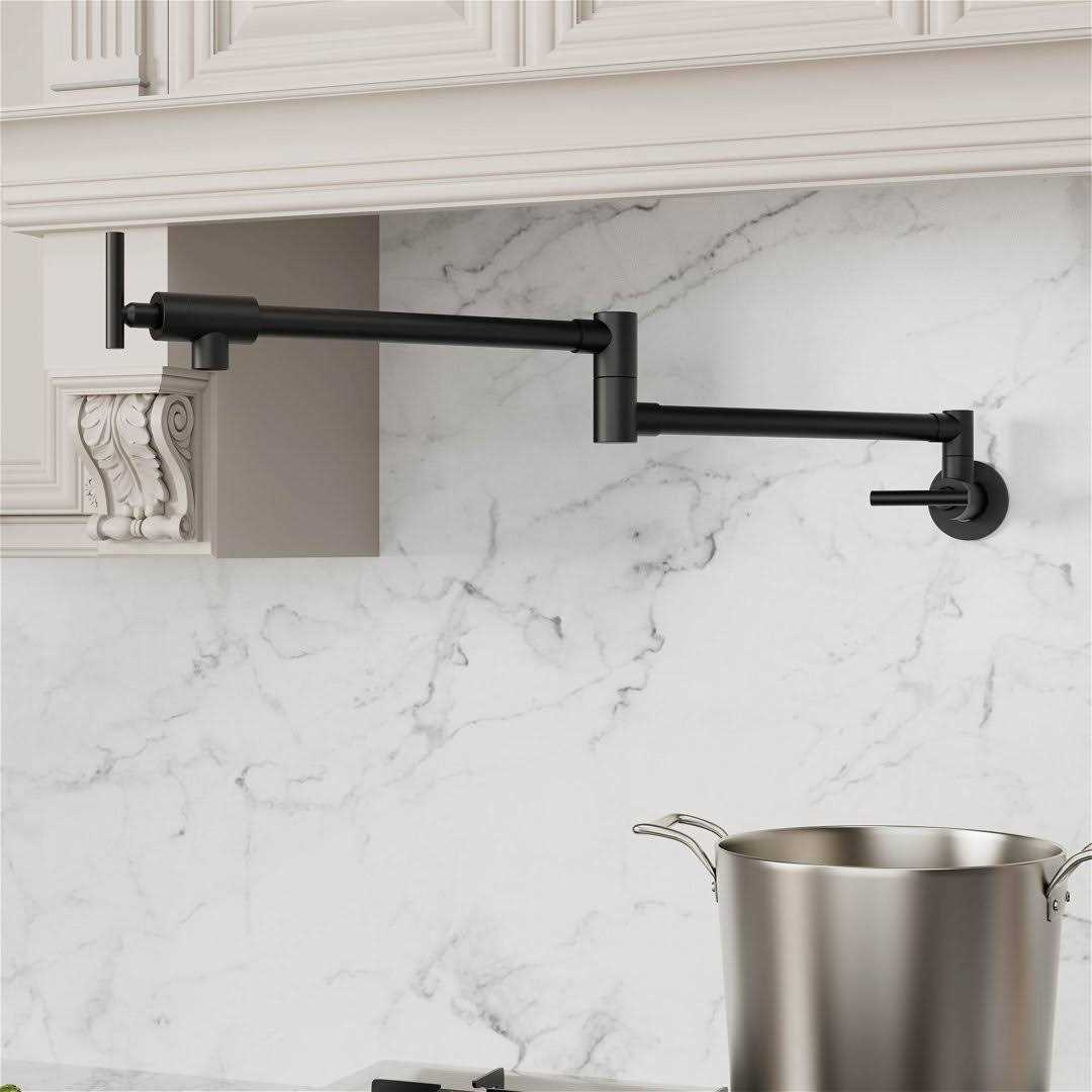 Filling pots on the stove has never been easier or more affordable, thanks to the new Giving Tree Pot Filler faucet. This farmhouse Pot Filler features a wall-mount, dual swing joint design with dual shut off valves and a 2.2 gpm flow rate to match daily use. A pot filler makes it easy to fill cooking vessels quickly and without the walk from sink to stove. Built using steel and brass the cUPC certified pot filler delivers reliable durability, convenient articulation and long-lasting performance. Color: Matte Black.