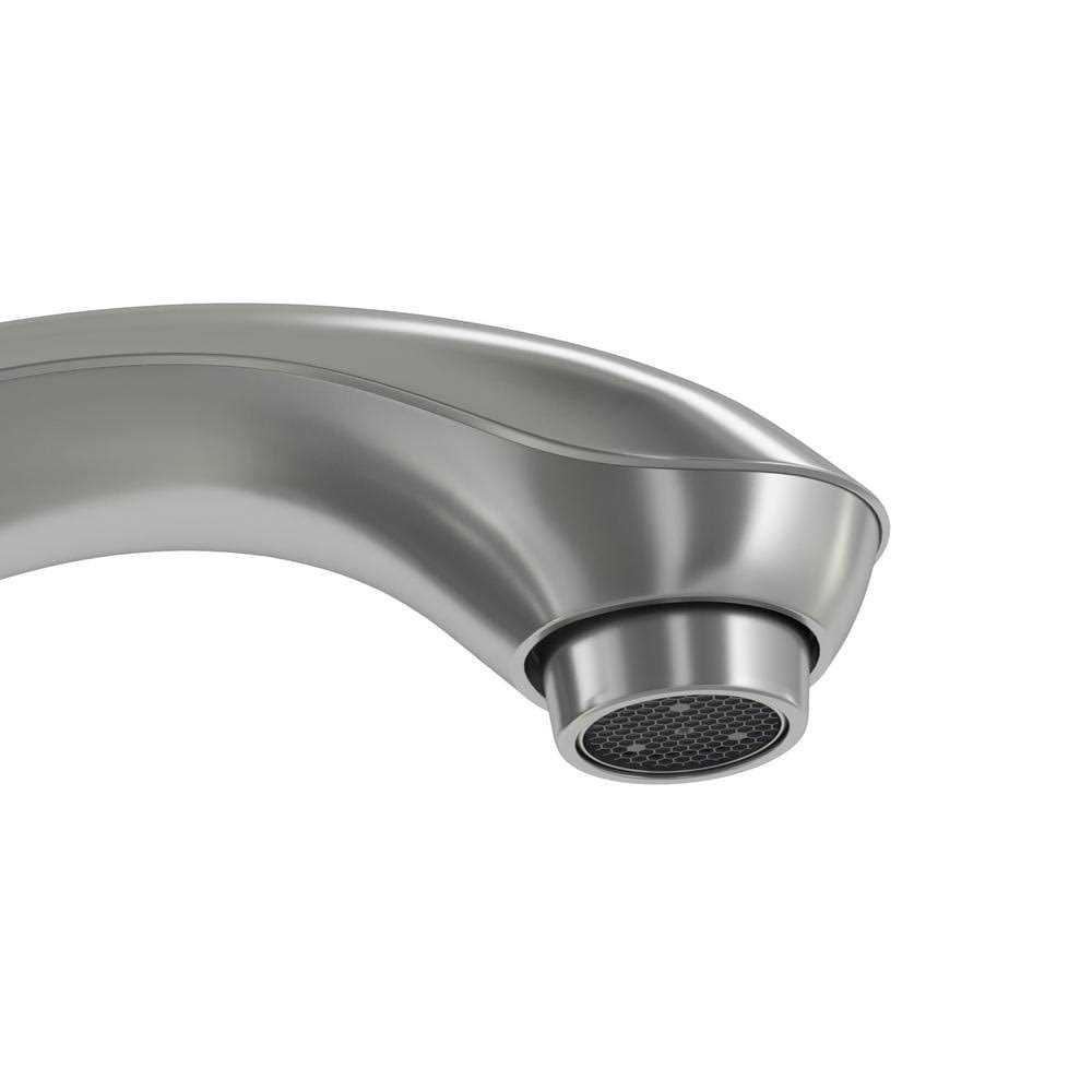 Centerset 2-Handle Low-Arc Bathroom Faucet in Brushed Nickel has a sleek and shapely, curved design that will complement a wide variety of bathroom decor. WaterSense certified, this faucet has a 1.2 GPM water flow rate to help conserve water and ceramic disc cartridges to help prevent drips. The 2-handle lever design allows you to easily turn hot and cold water on and off. Durable with a brushed nickel finish, this faucet is easy to clean and easy to install with a 1/2 in. connection size and deck-plate mount. it also features the exclusive ClickInstall drain assembly for quick and simple installation. Pair with other pieces from the Builders Collection for a complete and polished look.
