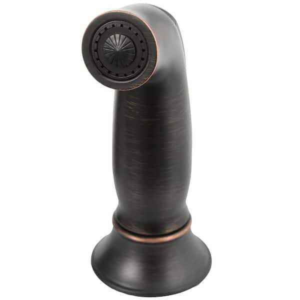 The Fairway 2-Handle Side Sprayer Kitchen Faucet in Bronze features a rich and beautiful design to complement a variety of kitchen decor. An elegant and high arc spout offers plenty of sink room for washing dishes or rinsing vegetables, while the matching side sprayer provides added convenience for these tasks. The ceramic disc valves help prevent drips for a lifetime of use. This faucet has a 1.8 GPM flow rate. Pair this faucet with other bronze pieces from the Fairway Collection for a complete look.