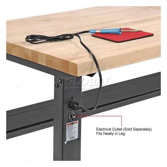 A workman’s dream bench. This solid, rugged top stands up to constant, heavy pounding. Hardwood is kiln dried, electronically glued, sanded to 1-1/2″ thickness and has laminated edges. Finished with a penetrating mineral oil for a durable high quality appearance. 96″ L benches include 3 leg frames for stability and reinforcement. Adjustable height legs feature removable duplex knockouts on front and rear for installation of either a hard wired electrical outlet or an optional plug-in outlet that easily screws into place with no wiring necessary. Steel parts are finished with scratch resistant black powder coat. Bench stringer comes with mounting hardware to assemble legs to the bench top. Leg height adjusts in 1-1/2″ increments.