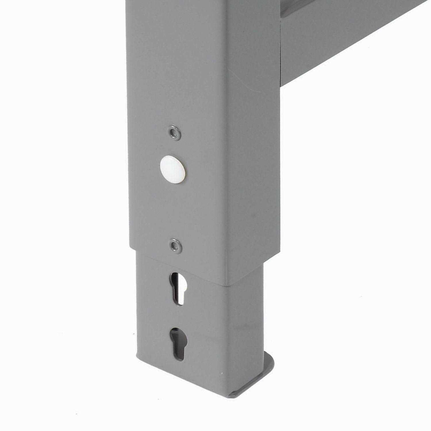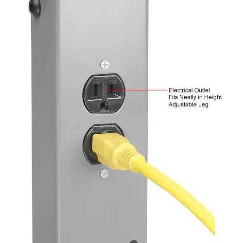 This solid, rugged top stands up to constant, heavy pounding. Hardwood is kiln dried, electronically glued, sanded to 1-3/4″ thickness and has laminated edges. Finished with a penetrating mineral oil for a durable high quality appearance. Adjustable height legs feature removable duplex knockouts on front and rear for installation of either a hard wired electrical outlet or an optional plug-in outlet that easily screws into place with no wiring necessary. Steel parts are finished with scratch resistant gray powder coat.