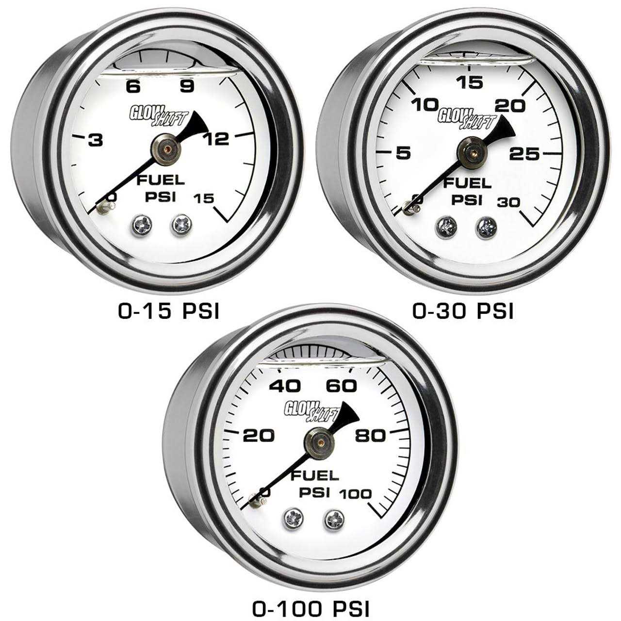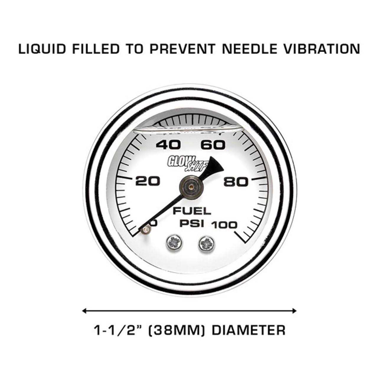 GlowShifts 1-1/2 Liquid Filled White Face Mechanical 15 PSI Fuel Pressure Gauge is the perfect monitoring tool for your carburetor vehicle. This mechanical gauge reads from 0 to 15 PSI and installs directly to the fuel system under the hood with the included 1/8-27 NPT thread attached to the back of the gauge. Each gauge is liquid filled with silicone oil that helps protect the needle from the powerful vibrations of the engine, giving you the readings youre looking for. Housed in a waterproof, chrome body, this gauge is built to last. This gauge features a sleek look with a white gauge face, a black needle and a clear lens to easily view the fuel pressure readings. The included brass 90 degree thread fitting helps reposition the gauge in the engine bay to a more accessible angle, if needed.