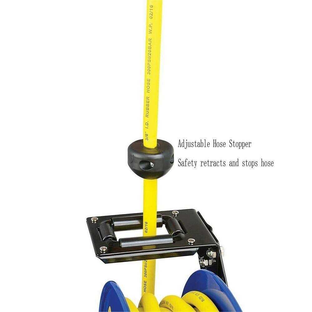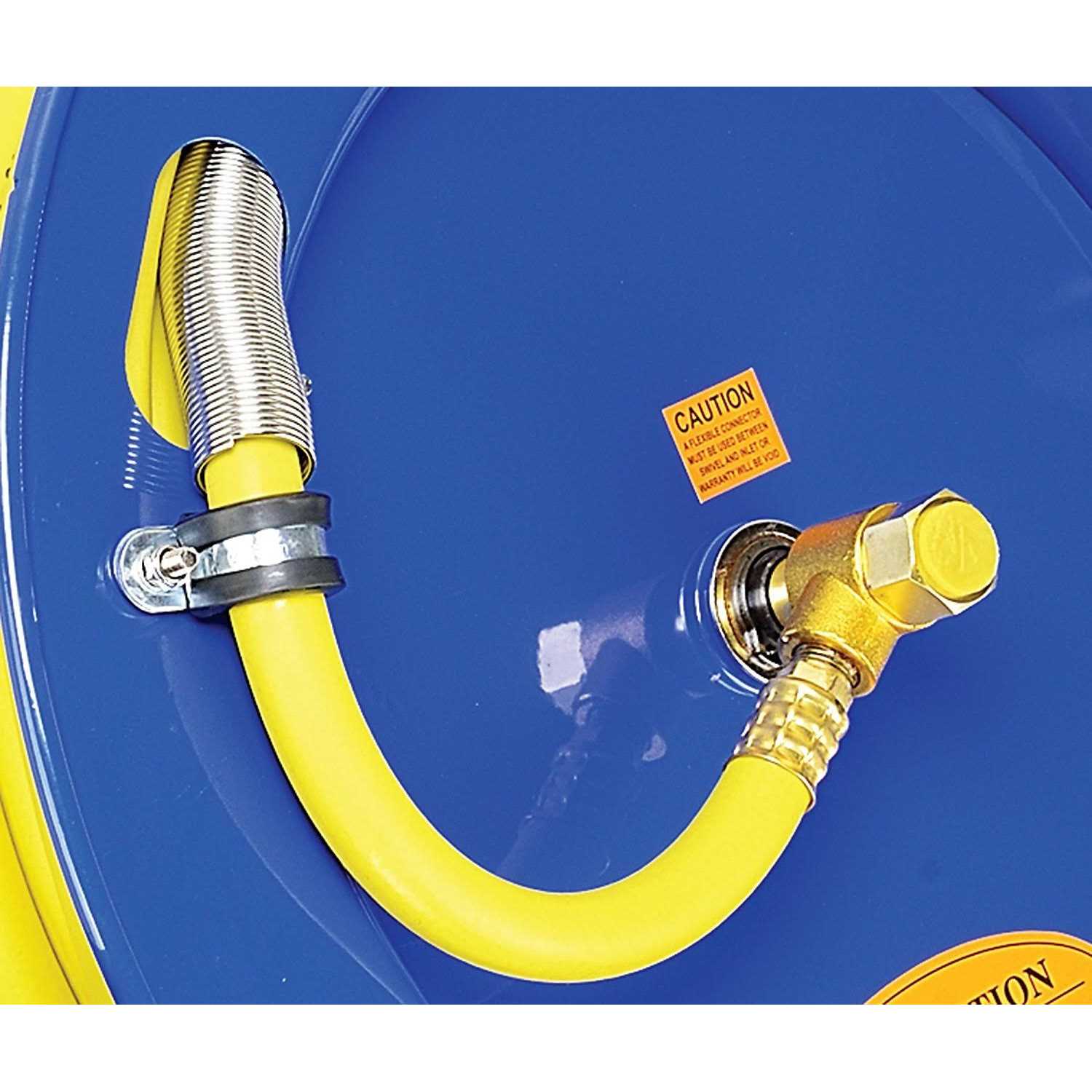 The Goodyear Steel Retractable Air Compressor/Water Hose Reel is manufactured using powder coated steel for strength and corrosion resistance. It can be wall, ceiling or floor mounted. The full flow solid swivel joint ensures smooth, uninterrupted fluid flow. The multi-position release ratchets spring is fully enclosed. The hose is guided by four non-snag rollers that guide retraction and reduce abrasion and wear on the hose.