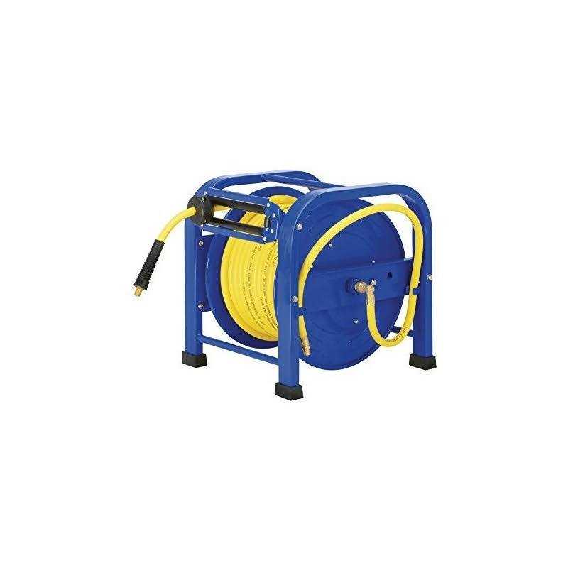 The Goodyear Quad-Stand retractable air hose reel is constructed using high-quality 2-stage powder coated steel with a unique quad frame construction for easy transport. The ratcheting mechanism automatically locks the hose at your desired length, and the durable frame keeps the hose reel planted and stable, with a hybrid polymer hose designed to eliminate kinks. All the product parts are ISO 9001 certified, CE approved, and quality control tested for spring endurance and leakages.