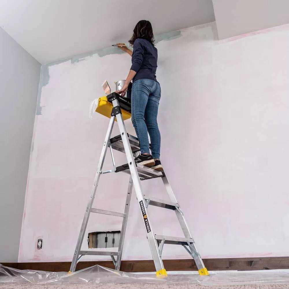 Removable bucket with tons of room for tools, paint, and more Two large standing platforms for comfort and safety Comparable reach height to a traditional 6ft stepladder This all-new 5.5 ft. Aluminum Dual Platform Ladder solves all the problems you’ve ever had with a traditional stepladder. The ladder features dual platform top steps, giving you 3x the step depth of a traditional ladder and providing a safe, secure, and comfortable place to complete your projects without hurting your feet. The brand-new Removable Bucket Tray gives you a huge, accessible work area that’s perfect for paint cans or trays, tools, hardware, and everything else you’ll need to keep handy while working – and it stores conveniently out of the way when your project is complete. The Pro-Grade aluminum construction is lightweight, yet safe and strong with an ANSI Type 1A 300-lbs. Duty Rating, and the unique design allows the ladder to be quickly and safely opened or closed with one hand, saving you time on the job and avoiding the pinch points of other ladders with spreader bars. With the same reach height (10 ft.) as a standard 6 ft. stepladder, this Heavy-Duty Aluminum Dual Platform Ladder is built tough for superior performance and long-lasting durability.