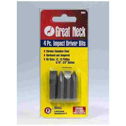 The GreatNeck 4 piece impact bit set is made with hardened and tempered chrome vanadium steel for strength and durability.