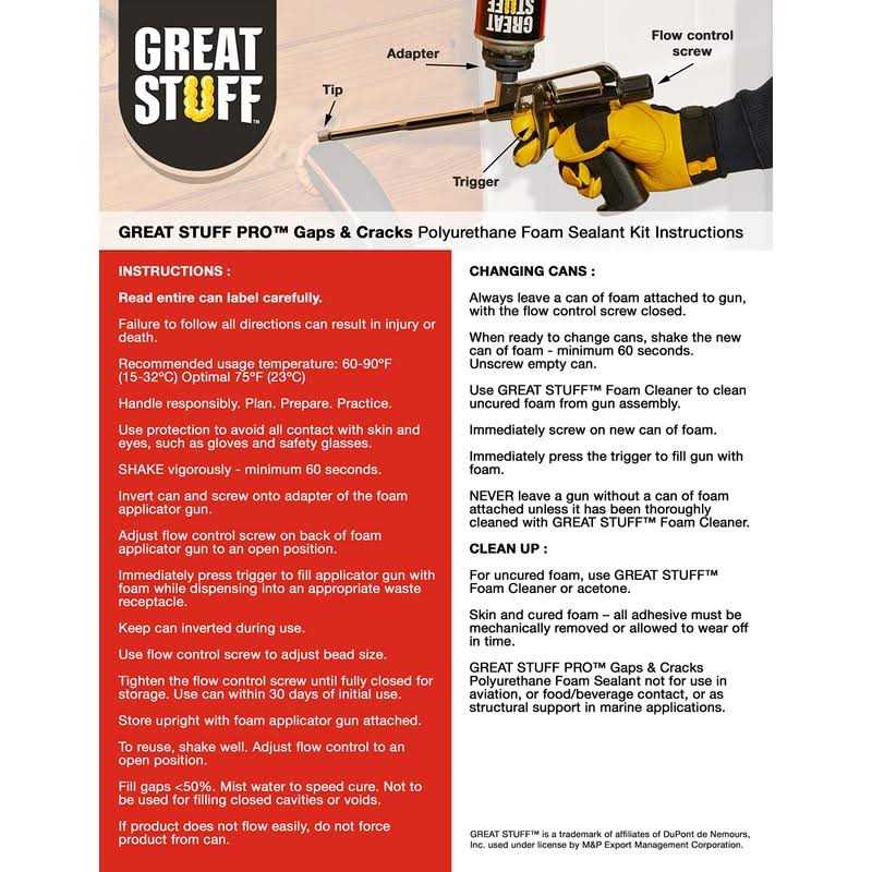 GREAT STUFF Gaps and Cracks Foam Sealant Kit reduces unwanted airflow and improves energy efficiency all around the home. Gaps and Cracks expands to fill openings, creating long-lasting, fire-rated seals around plumbing and electricity penetrations, duct work, sill plates and rim joists from basements, to attics. Using our GREAT STUFF Contractor Kit is easy. Pop the top off the can; screw it onto the gun; open the gun’s valve; press the trigger and you are good to go. Still have foam left, leave the can attached to the gun and close the valve until the next use. Use the cleaner on the outside of the gun and clean the inside when you are going to store it for a longer time. After you use the cleaner, remember to remove the can and empty the cleaner from the gun. Fills, seals and insulates gaps up to 3 inches, forming a long-lasting, airtight and water-resistant barrier Recognized as a fire-rated sealant and is orange colored for easy recognition Bonds with most building materials and surfaces and is tack-free in 3 to 10 minutes Trimmable, sandable and paintable and can be used for both interior and exterior projects Features precise application with no mess and stores easily for use on future jobs