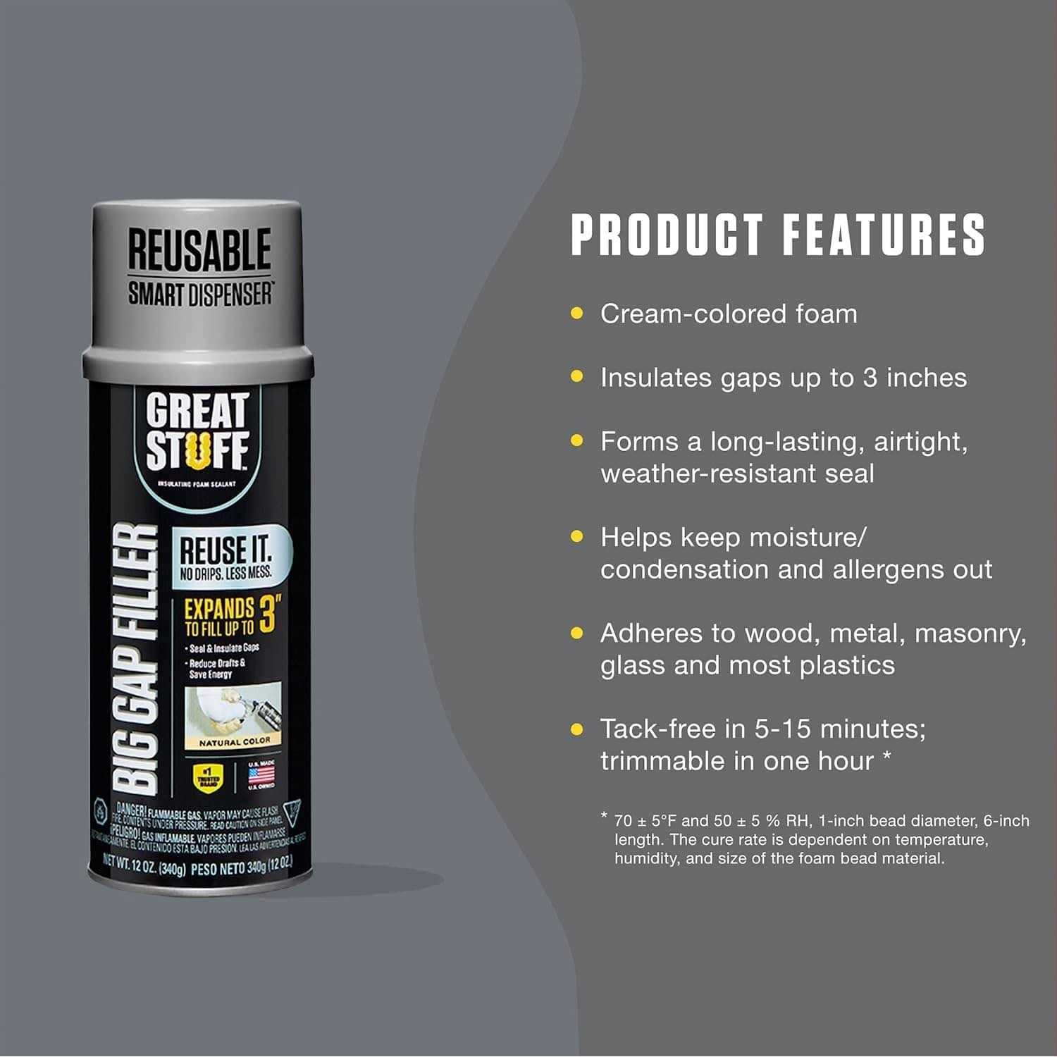 FILL BIGGER GAPS. This expanding foam insulation fills, seals and insulates gaps up to 3″. This ready-to-use sealant is specially formulated to take on common areas of energy loss such as rim joists/sill plates, plumbing, HVAC and larger penetrations. DISPENSE SMARTER. Securely thread the Reusable Smart Dispenser and leave attached to the can to seal projects for up to 30-days. Insulating foam stops as you stop for clean, easy, no-drip dispensing and increased precision with more control. SPRAY ANYWHERE. Tackle a variety of projects with exceptional adhesion to building materials on both the interior and exterior of your home. Adheres to wood, metal, masonry, glass and most plastics. LOWER ENERGY BILLS. Increase your home’s energy efficiency by stopping air leaks, which account for 25 – 40% of HVAC energy costs. This expanding foam forms a long-lasting, airtight, weather-resistant seal — keeping unwanted air and moisture out. VERSATILITY. Stop waiting around and keep the pace of your projects on target. This foam sealant dries tack-free in 20 minutes and cures rigid for trimming in 1 hour. Trim, sand, stain and paint for a truly GREAT finish to your DIY projects. Great Stuff is even greater! Introducing the new patent-pending Great Stuff smart dispenser! The next generation of foam sealant dispensing is a game-changer: reusable for up to 30 days, It allows Great Stuff to be used again and again! It doesn’t drip, eliminating mess; p strong Helpful Tips /strong – ul li Shake vigorously for a minimum of 60 seconds. If the can sputters, simply shake the can while held upside down. /li li Any uncured product that gets on the skin can be removed with acetone. /li li Best results if used when product temperature ranges from 60-90°F (15-32°C). The can should not be exposed to temperatures more than 120°F. Cured foam should not be exposed to temperatures in excess of 240°F. /li li Firmly screw straw assembly onto valve and dispense SLOWLY. /li li Mist with water to speed cure. /li li Trim cured foam with serrated blade. /li li If applied outdoors, be sure to paint or cover foam to prevent discoloration and UV damage. /li li Great Stuff cans featuring the straw tube applicator will seal shut if left to sit for more than 2 hours after its last use. /li li If using GREAT STUFF SMART DISPENSER, follow these additional steps before application: /li li Great Stuff cans featuring the Smart Dispenser may be reused up to 30 days with the straw left attached to the canister, just clean the tip after your first use. /li li For best results: ul li Thread the SMART DISPENSER onto the valve until it is secure, ensuring there is no gap between the dispenser and the valve. /li li Do not unwind the dispenser after you have started using it. /li li Let up on the trigger slowly to release pressure in the straw and prevent spurts during the next use and to achieve the most consistent bead. /li /ul /li /ul
