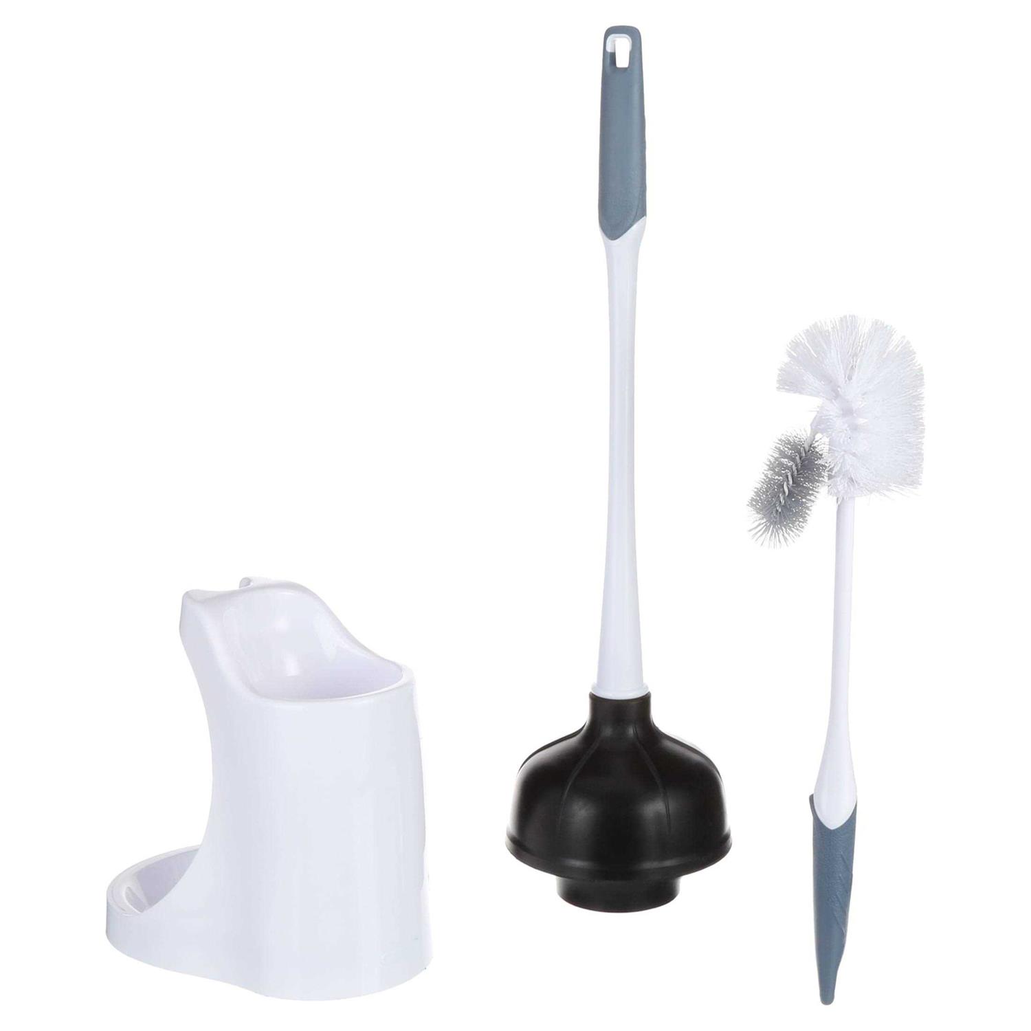 - Bathroom caddy set includes 1 brush, 1 plunger, and 1 caddy