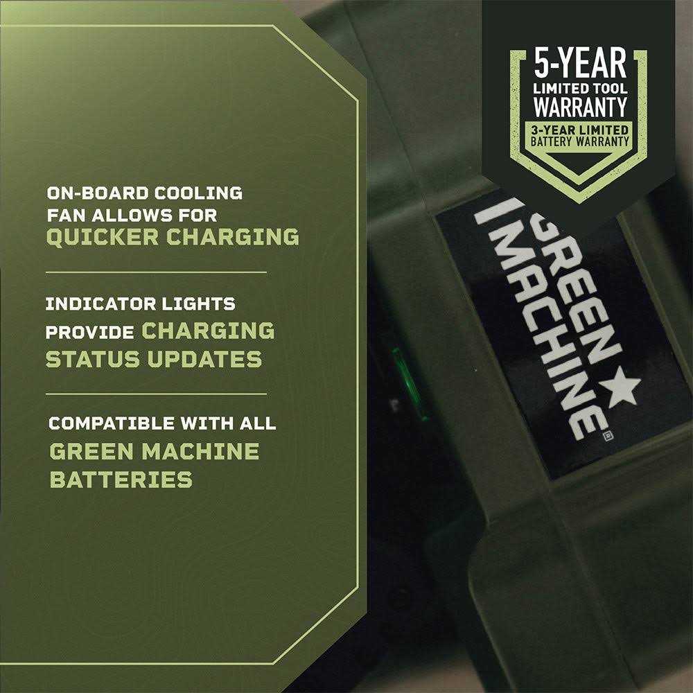Green Machine 62 volt standard charger is compatible will all Green Machine 62 volt batteries. An active cooling fan maintains ideal battery temperature while charging.