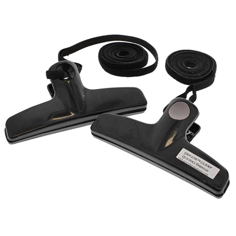 For use with Longarm and Midarm Quilting Machines Even tensioning of fabric Lightweight providing secure 6-inch grip Easily open with one hand Come in black or Red colors Tired of heavy, hard-to-squeeze and use side clamps for your Longarm / Midarm quilting machine? Or clamps that grip and pull on only an inch or two of the quilt thereby distorting the side of the quilt? No more! The Grip-Lite side clamps are super lightweight providing a secure 6-inch grip and easily opened with one hand! Each clamp comes with 6 feet of double-sided hook and loop tape and a short elastic strip for fast attachment to any frame. And testing your machine’s tension has never been easier. Whether two clamps are used on each side of the quilt or just one is based on personal preference and the size of the machine being used. Weighing only 4 ounces (including the Velcro strap), the Grip-Lite side clamps don’t weight the quilt down unlike other side clamps. Also, the Grip-Lite side clamps’ jaws are 6 inches wide providing a more uniform grip across the mounted quilt thereby avoiding distortion. The Velcro strap will attach to itself because one side is the hook side and the other side is the loop side. This allows the Grip-Lite side clamps to attach easily to any frame. The strap is about 6 feet long and 3/8″ wide. Also, there is a short piece of elastic sewn onto the Velcro and that loops through a hole on the clamp. This facilitates clamping the clamps onto the quilt.