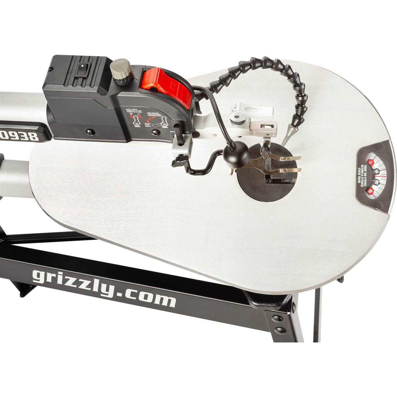Tilting table with easy-to-read bevel scale Cam-action blade release for quick tool-free blade changes Compatible with pin-end and plain-end blades Adjustable gooseneck LED work light Flexible sawdust blower Sturdy metal stand The G0938 18″ Scroll Saw with Stand cuts smoothly, quietly, and accurately using either pin-end or plain-end blades. The cam-action scroll saw blade release allows for quick tool-free blade changes. Also it helps makes those difficult time-consuming interior cuts quick and easy. Get in and out of these important cuts in only seconds. Featuring variable-speed control, the G0938 allows you the flexibility to dial in your cutting speed between 450–1500 SPM based on the hardness of your workpiece. The cast aluminum tilting table has a built-in easy-to-read bevel scale for tilting capability from-15° to 45°. To keep your workpiece visible and free of debris, the G0938 has a built-in flexible LED work light and dust blower. FEATURES: Tilting table with easy-to-read bevel scale Cam-action blade release for quick tool-free blade changes Compatible with pin-end and plain-end blades Adjustable gooseneck LED work light Flexible sawdust blower Sturdy metal stand Tilting table with easy-to-read bevel scale Cam-action blade release for quick tool-free blade changes Compatible with pin-end and plain-end blades Adjustable gooseneck LED work light Flexible sawdust blower Sturdy metal stand