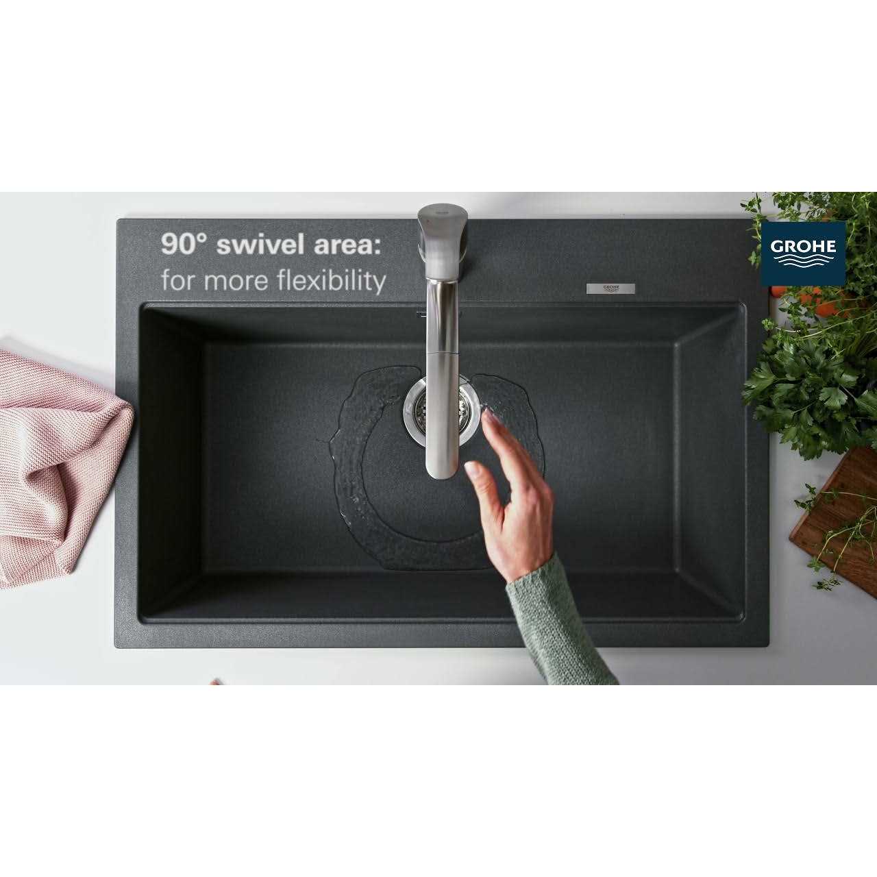 - Smooth 90-degree swivel radius for optimal reach within the sink