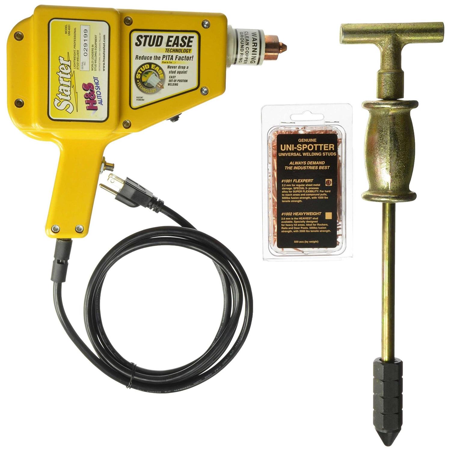 The Uni-Spotter 4550 Starter Kit Plus Is a great entry level kit. Use this kit as a base to build a complete Uni-Spotter Stud Pulling System. The 4550 Starter Kit features the Uni-Spotter exclusive ÒStud Ease TechnologyÓ. Increase accuracy when pulling small dents. Weld studs easier and faster. Stud Ease holds the welding stud in the welder regardless of the direction the welder is pointed. No longer does the stud fall out of the welder when the welder is pointed in a downward direction. Built-in overload protection. Super sensitive trigger in handle for one-handed operation. Patent pending.