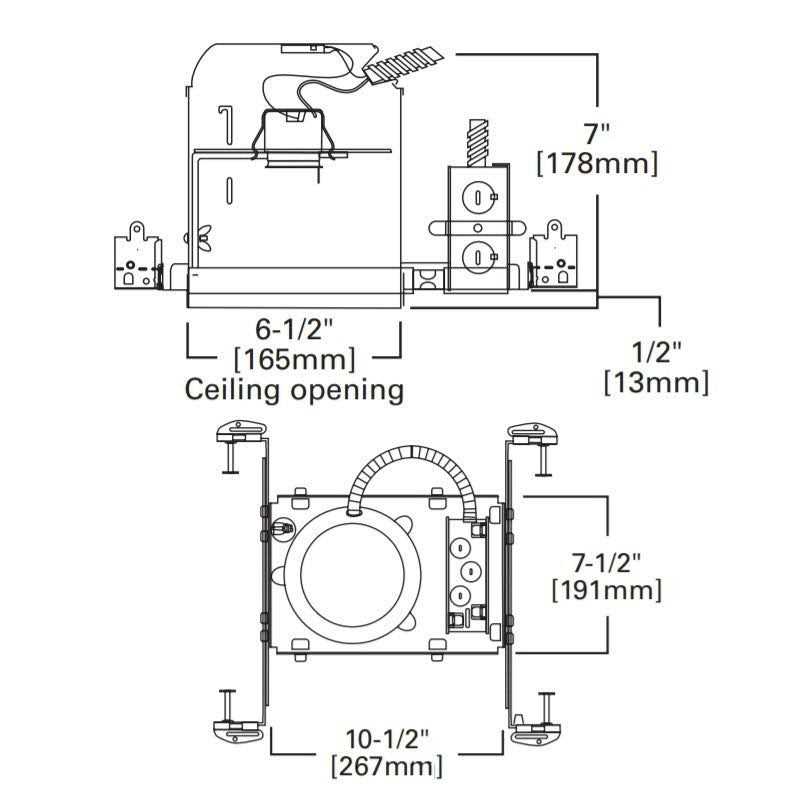 Cooper Lighting Halo 6-Inch Recessed housing in silver color measures 10.500 Inch x 7.500 Inch x 7 Inch and is made of aluminum housing for greater heat dissipation. Housing is designed to prevent airflow between living spaces and unconditioned areas. It has Pass-N-Thru tool-less shortening of bar hangers with slide-N-side wire traps. It features quick connect wiring connectors included in junction box with seven 1/2 Inch pryout knockout and is thermally protected. Housing can be removed from plaster frame for junction box access. It does not contain socket bracket for the use with socket supporting trims and is ideal for commercial/residential. It has 6.500-Inch aperture.