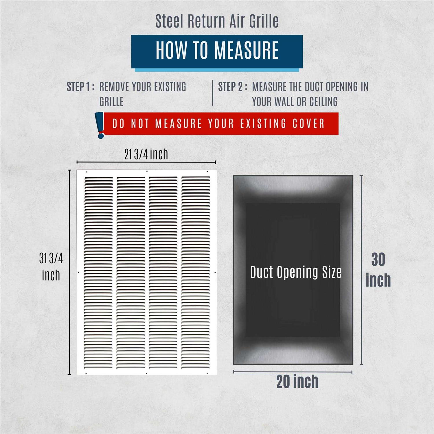 Return Air Grille for 20 inchx30 inch Duct Opening, White, Steel 1/3 inchspaced fins set at 50 degrees. Primary use: Side wall and ceiling. Screws are included with the system, standard. All-steel construction. Durable white powder coated. Standard color is white (Ral9016). How To Measure A Grille- Always measure the size of the duct opening (the “hole” in the duct/wall). Do not measure the entire size of the register itself. Size of the grille is; listed size +1.75-inch.- Understanding Width & Height- In a grille size, the first number always represents the width and the second one is the height. As an Example: If the hole on your wall/duct is 20 inch wide by 30 inch tall, order 20×30 option. If the hole is 30 inch wide by 20 inch tall, order 30×20 option.- For this particular product you’re viewing at the moment, the hole on your wall/duct opening should be 20 inch- Wx30 inch- H.Click the ‘Add To Cart’ button now to order your Return Air Filter Grille!