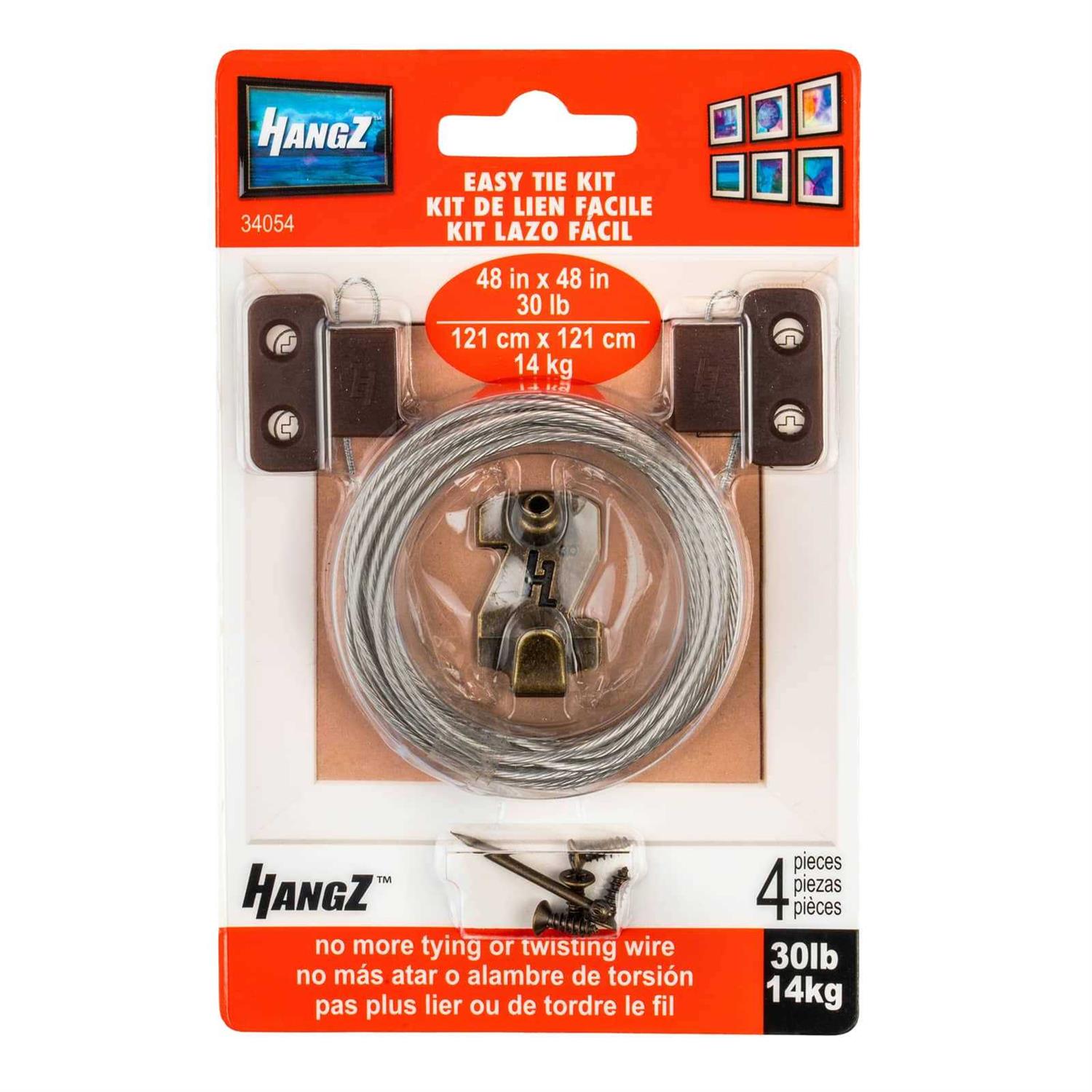 The HangZ Easy Tie 2-Hole D-Ring Kit’s patented design eliminates the need to tie wire the old fashioned way. Wire will never slip or untie. Keeps hands clean and protects fingers from injury. Kit also keeps hardware completely hidden. No more unsightly hardware exposed. Never see the hook again. Ideal for canvas and open back frames. Holds up to 30 lbs. Kit includes two 2-Hole D-Ring Picture Hangers, 9 ft. L coated picture wire (made to be cut to desired length), one 30 lbs. HangZ Gallery Picture Hook and mounting hardware. Designed to protect your fingers from injury Steel construction ensures prolonged use Withstand weight up to 30 lbs. Patented design eliminates the need to tie wire the old fashioned way Keeps hands clean and protects fingers from injury Hardware stays completely hidden – never see the hook again Holds up to 30 lbs. Eliminate the need to tie wire the old fashioned way with the selection of this beautiful HangZ Easy Tie 2-Hole D-Ring Kit. Convenient to install.