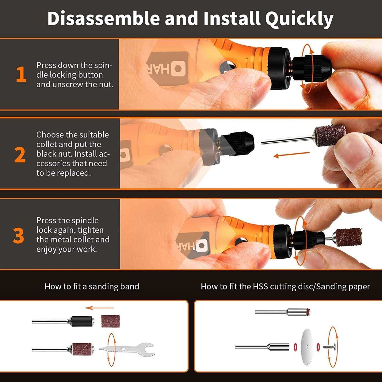 【Versatile Rotary Tool Set】This rotary tool set includes a high-performance and low-noise rotary tool with 61 of the most popular power rotary tool accessories for fine DIY work. Ideal for carving, sanding, grinding, polishing, or cutting, this electric rotary tool is perfect for creating resin crafts. It’s like having a whole toolbox in one convenient package. Note: Not suitable for heavy-duty projects 【5-Speed Settings】The cordless rotary tool has 5-speed adjustments (5000/8000/11000/14000/18000RPM) for easier speed control and to meet the power demands of different tasks. This allows for safe and careful sanding in stages, even for beginners who can easily control the speed. With the micro rotary tool, your creations are always handy 【Compact and Lightweight】This rotary tool is powerful yet small and light, giving you ultimate control and precision, as well as comfort, just like holding a pen 【Quick USB Charging and Longer Running Time】The cordless rotary tool comes with a 3.7V rechargeable battery that can work continuously for 200 minutes. A single charge can be used multiple times, making it stress-free and convenient. Battery-powered rotary tool allows you to work one after another. (The indicator light will turn green when fully charged) 【Rotary Drill with LED Indicator】The upgraded small cordless rotary tool has a blind spot lighting LED design, which reduces backlight shadows and overcomes the adverse effects of dark areas on the use of the drill for resin. This provides you with a better experience and more precise work Product Description HARDELL MINI Rotary Tool is lightweight and small, you can carry it with you. It is suitable for different DIY working situation Product Features: Cordless design: Cordless design of the rotary tool allows use anywhere without the need for an electrical outlet. USB Charging: Equipped with a Type-c power cord, making charging easier and more convenient. Spindle Lock: Onboard spindle lock makes for quick and easy bit changes. Variable Speed Tool: With 5 different levels of RPM, which can be adjusted from 5000 to 18000 RPM. Easy to use: You can grip it like a pen for ultimate control and precision as well as for comfort. Ergonomic streamlined design with overload power-off protection for safe and reliable operation. Application: Fit for grinding pet nails and detailed works like sanding, polishing, carving, and cutting. Product Contents: 3.7v Cordless Rotary Tool and 61 Accessories(include USB) Cordless Rotary Tool with 61 pcs Accessories What you will get: Cordless Rotary Tool x1 Sanding Bands x28 Sanding Papers x10 Grinding Bits x5+ Diamond Bits x5 Collets x3 + Mandrels x2 Polishing Wheels x2 + Twist Drill Bit x4 + Cutting Disc x2 Accessories Case x2 Type-c Cable x1 Warning Not for Heavy-duty Projects Do not press the lock button until the tool fully stops, or it may cause damage or even injury. Please refer to the instruction manual for a detailed operation guide. Very useful for arts and crafts projects and small home repairs and are excellent for working in small or hard-to-reach spaces Specifications 1. Rating: 3.7V 2. 5-Speed: 5000/8000/11000/14000/18000RPM (no load) 3. Color: Orange 4. Collet Size: φ1.6mm/φ2.3mm diameter 5. Charging Port: Type-C 6. Tool Weight: 0.135kg 7. Tool Size: 3.4*17.5CM 5 Rotation Speed 5 Rotation Speed controlled, you can make the speed control finely by adjusting the tool to better complete the job. USB Charging Rechargeable via supplied compatible USB connector at any place, more convenience for your charging. Full charging time is about 2-4 hours, and the indicator light will turn green when it is fully charged. Easy to Use The cordless tool with φ1.6mm and φ2.3mm compatible collet and spindle lock allows you to quickly and easily change accessories on Rotary tools. (Please make sure the bits are fixed in the rotary tool every time) LED Working Light Featuring the built-in front LED light, projects are well-lit evenly and this illumination keeps perception of fine detail Installation Instructions Application Sanding Sanding belts and sanding discs can help your handmade crafts become smoother and smooth out the uneven surface of crafts. Such as steel rust, paint and rough wooden boards can be removed by the sanding rotary tool. Carving It is very easy to use for accurate DIY craft engraving on glass, wood, metal, plastic, mirrors, and other materials. You can engrave any pattern you like to create a unique gift for your family and friends. Drilling This Cordless Rotary Tool can be used for diamond drilling. Different sizes of drill bits and special cutting heads allow you to work easily on wood. Polishing Mini Rotary tools can help you remove rust from some metal surfaces. polishing Wheel and Abrasive Stone are suitable for polishing various materials. Reduce the surface roughness of the product to make its surface bright and flat. Grinding You can easily remove rust and polish the metal surface of the object to make the