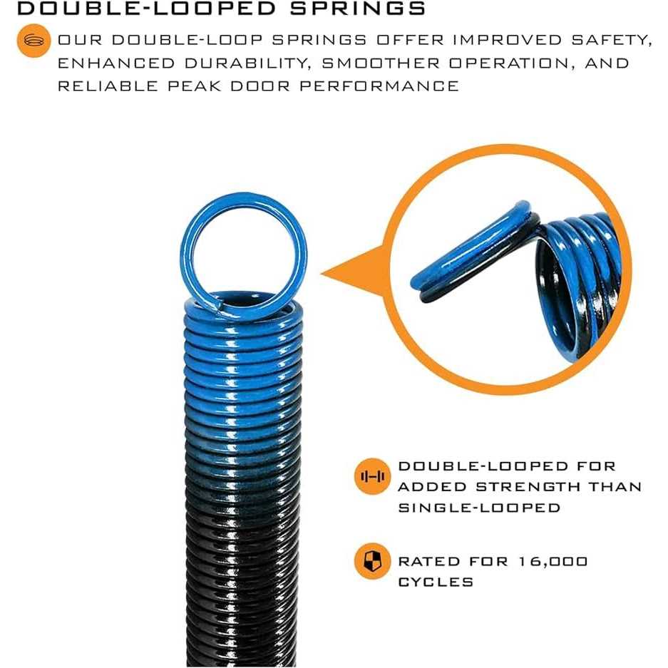 HEAVY DUTY double looped ends are two coils of the spring that connect to the eye-bolt and the pulley. This provide a sturdy replacement than single loops in the market. ELECTROPHORESIS black coating with min 16,000 cycles. Never need to lubricate the spring and keep you hands clean. AVAILABLE in color coded 90lb, 100lb, 110lb, 120lb, 130lb, 140lb, 150lb, 160lb, 170lb, and 180lb weight capacity to fit most 7ft hight door. Extension spring are color coded, but the color repeat every hundred pounds. Tip : Use a analog scale and place in center of the garage door. Release the extension spring and record the weight on the scale. SAFETY cable with the extra length of 144 inch x 1/8 inch 7×7 strand to avoid any spring to fly all over and during and after installation. The safety spring include 2 pcs S hook and 2 pcs three-eye splint.