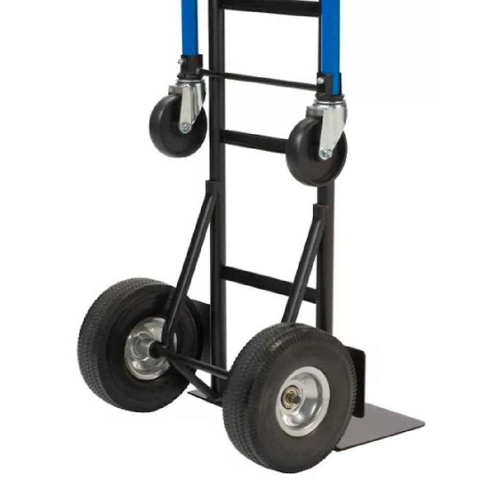 Harper Trucks · Hand Truck · 900 lb max load Four-in-one hand truck features a quick-change, convertible design that changes to four different truck positions and auto-locks into place with no pins or clips to lose. Solid rubber wheels and swivel casters allow easy maneuverability past bends and turns. Extra-large base plate supports large or small items to transport all of your supplies. Height-adjustable handle accommodates a wide range of users to help prevent strenuous movements during use. Heavy-duty, robotically welded steel frame supports up to 800 lb. when used as a two-wheel dolly, and up to 900 lb. when used as a four-wheel truck. Convertible design offers 4 different positions for versatile performance. Quick-latch mechanism eliminates need to use pins or clips. Solid rubber wheels and swivel casters ensure effortless maneuverability. Height-adjustable handle allows comfortable use by wide range of users. Heavy-duty construction supports up to 900 lb.