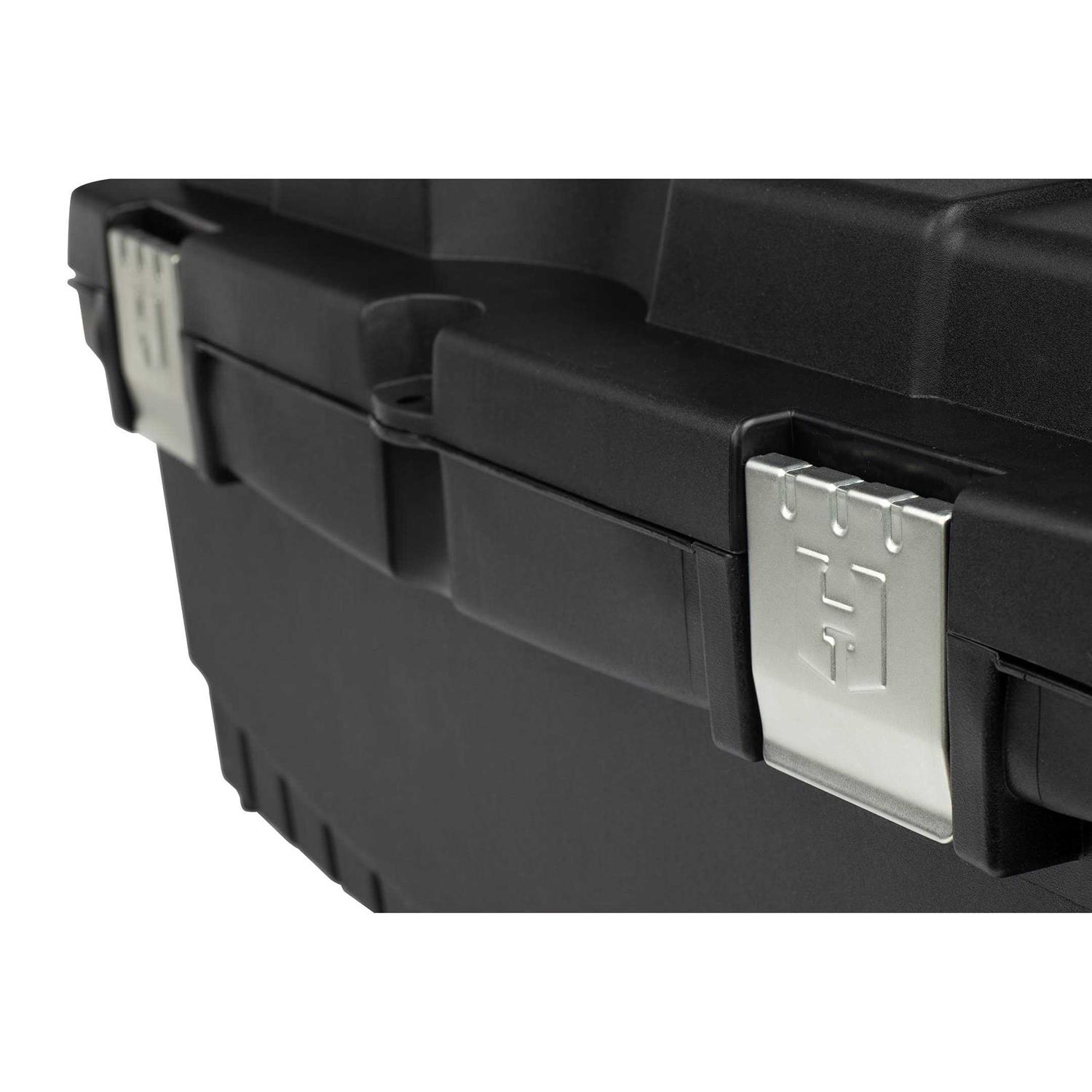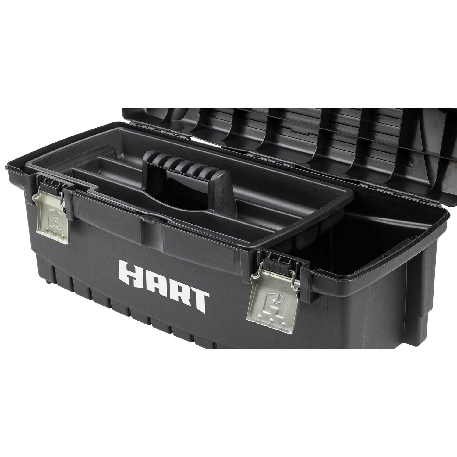The HART 26 Inch Toolbox delivers large capacity and portable storage for your tools and hardware. This lightweight box is ready to make your life easier with reliable tool storage. Metal latches provide a secure closure and a wide handle keeps this box in your hands.The deep storage compartment and a removable tray which add an extra layer of organization. The HART 26 inch Toolbox gives you a simple style that’s perfect for personal or professional use. The HART 26 inch Toolbox is made from resin, meaning it won’t chip, scratch, or rot. Made to withstand both heat and cold, this rugged box can be used in just about any weather conditions.