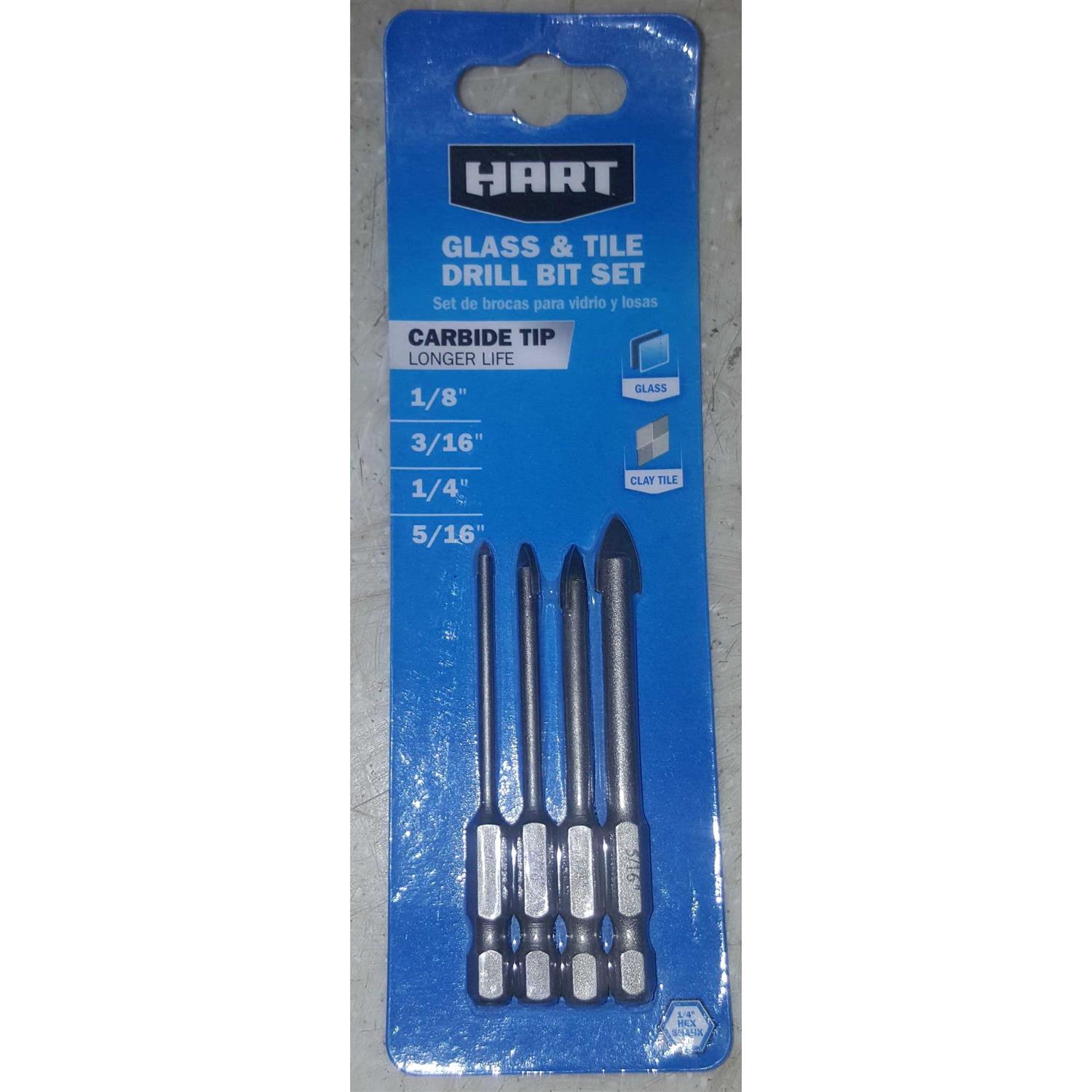 Designed for drilling in glass and clay tile, The HART 4 piece set features a carbide tip for added durability and longer life of the bit. The 1/4 inch hex shank allows for quick and easy bit changes. Recommended for use with drill/driver. Not for use on ceramic tile. Do not use these bits on hammer mode with your drill.