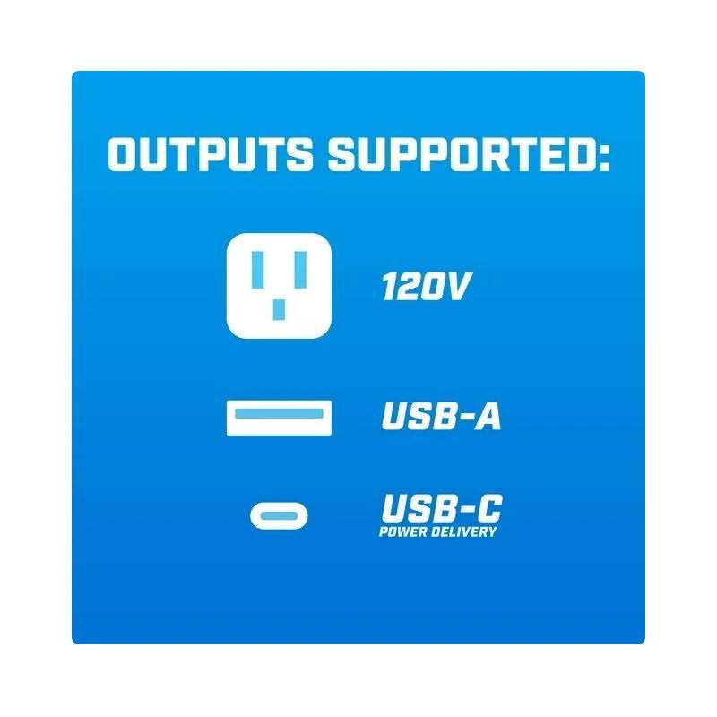 The HART 300-Watt Power Source is perfect for powering your laptops, tablets, cell phones and other small electronics. With a max output of 300 Watts, it’s great for on-the-go power or for backup use during power outages. The battery operated inverter features (1) 120V Outlet, (1) USB-A Fast Charging Port, and (1) USB-C PD Port to keep your devices powered on and running. The external LED light is perfect for emergencies or more visibility, and the carrying handle makes it convenient to transport wherever you go. Battery Sold Separately.