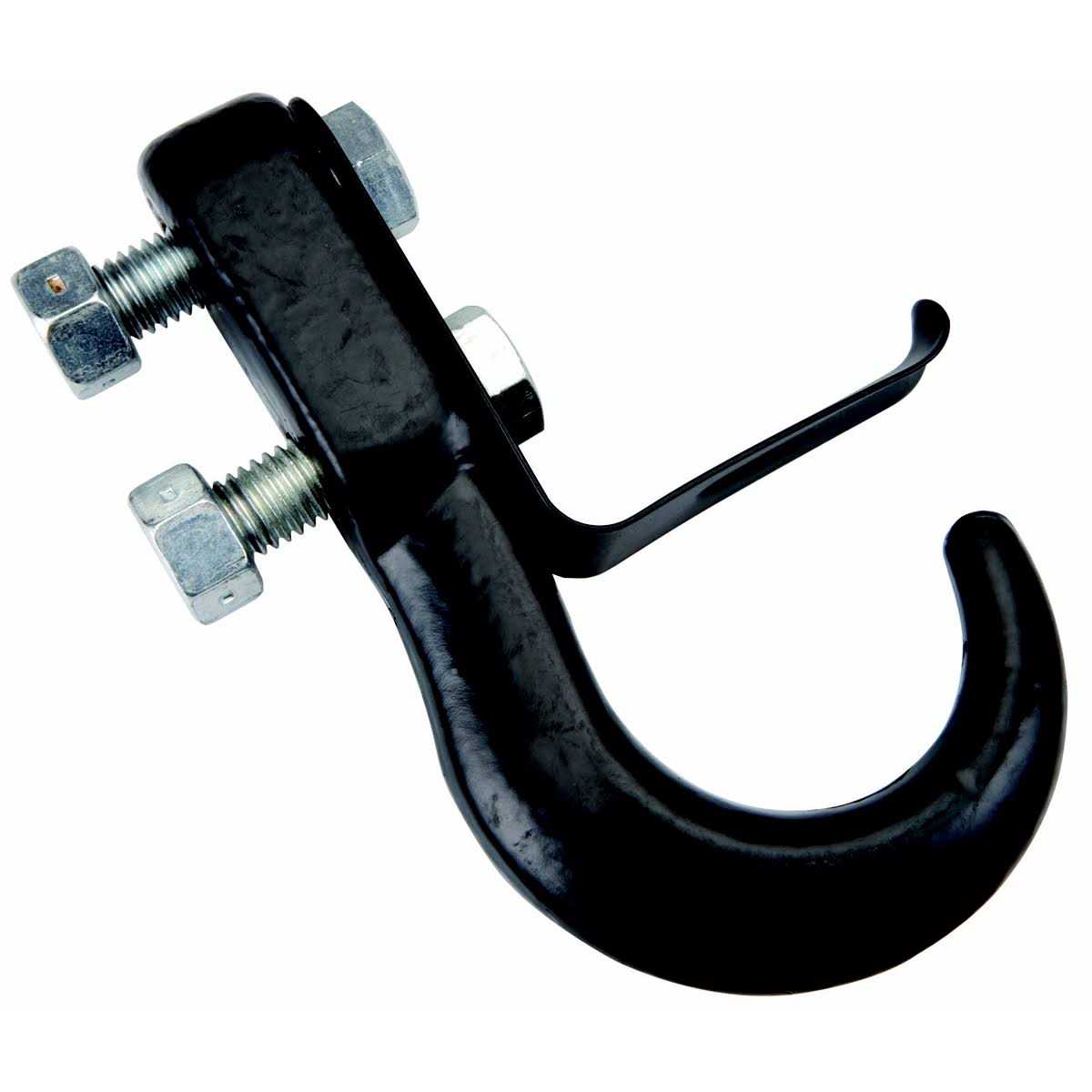 Mount this heavy duty tow hook to the frame of your vehicle for a stable load-bearing point. Designed for short-range pulling with a recovery strap to free a stuck vehicle or a tow strap for towing short distances on level surfaces. This tow hook has a steel safety clip to prevent accidental unloading. Forged steel with powder-coat protection. The kit includes everything you need for installation.