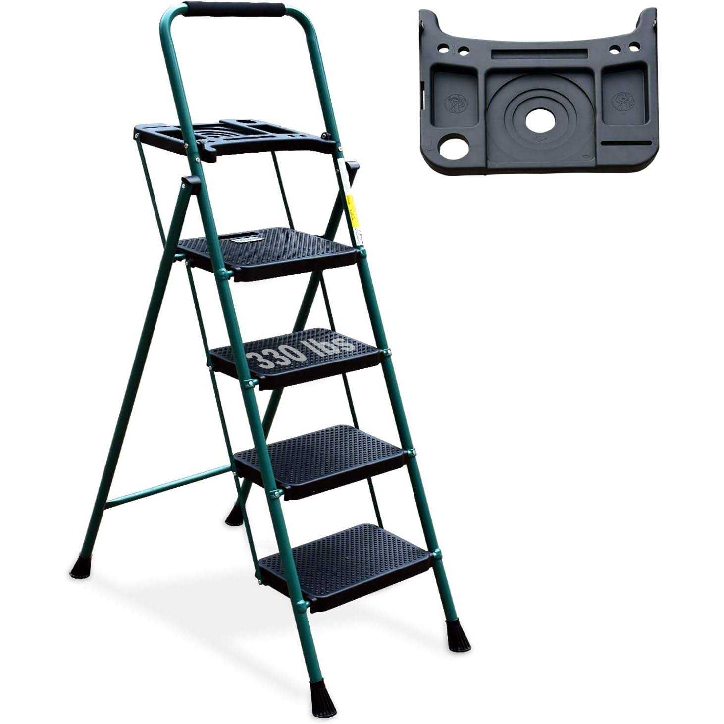 4 Step Ladder, Hbtower Folding Step Stool with Tool Platform, Wide Anti-Slip Pedal, Sturdy Steel Ladder, Convenient Handgrip – Green