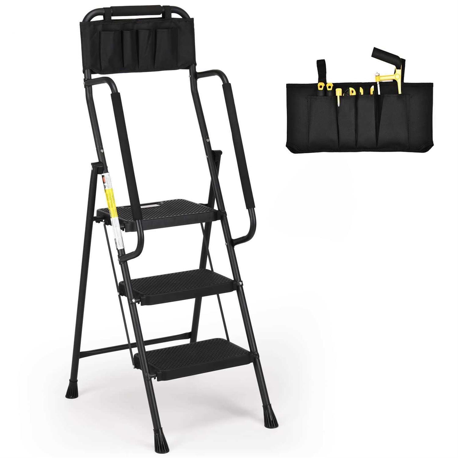 HBTower 3 Step Ladder with Handrails, Folding Step Stool with Attachable Tool Bag & Anti-Slip Wide Pedal for Home Kitchen Pantry