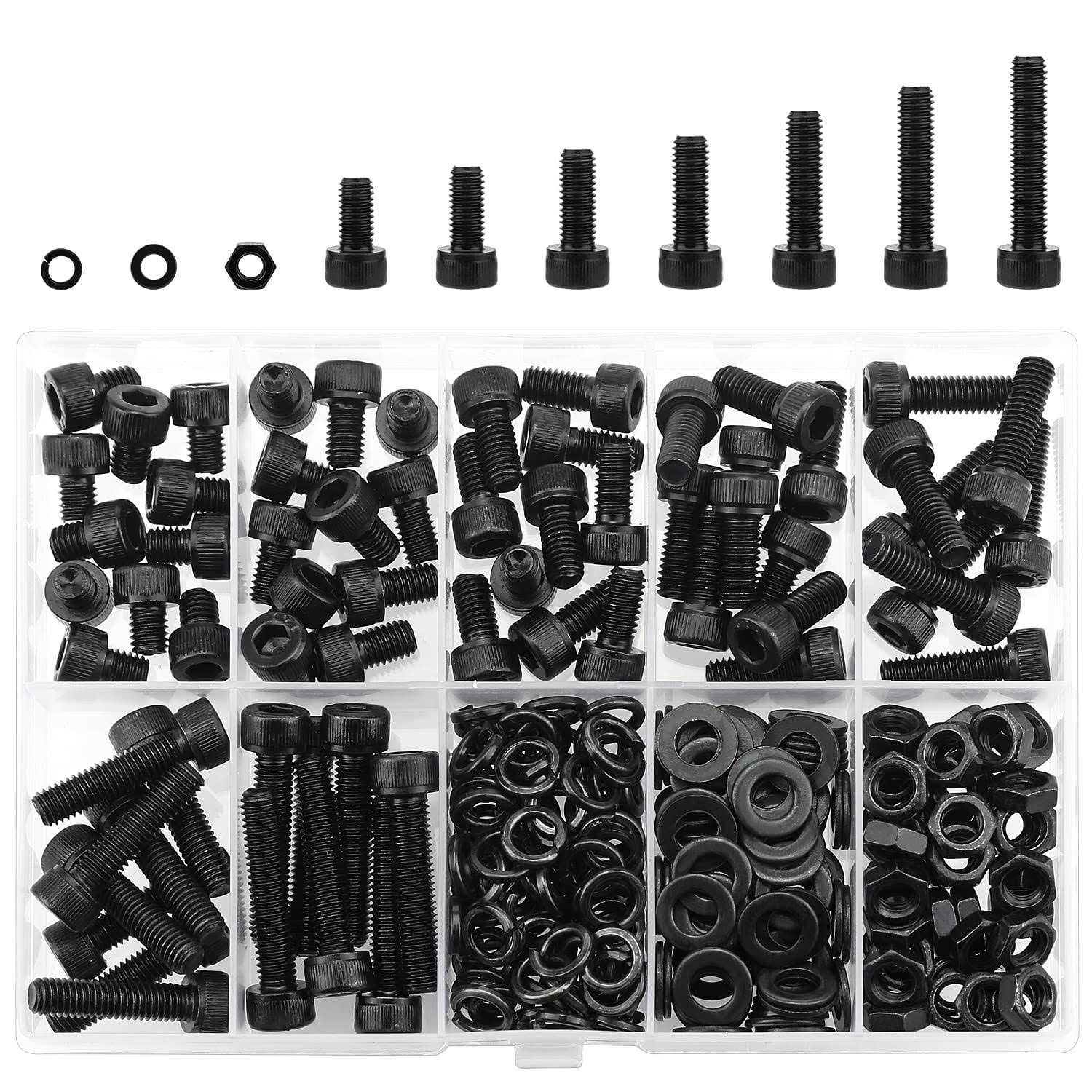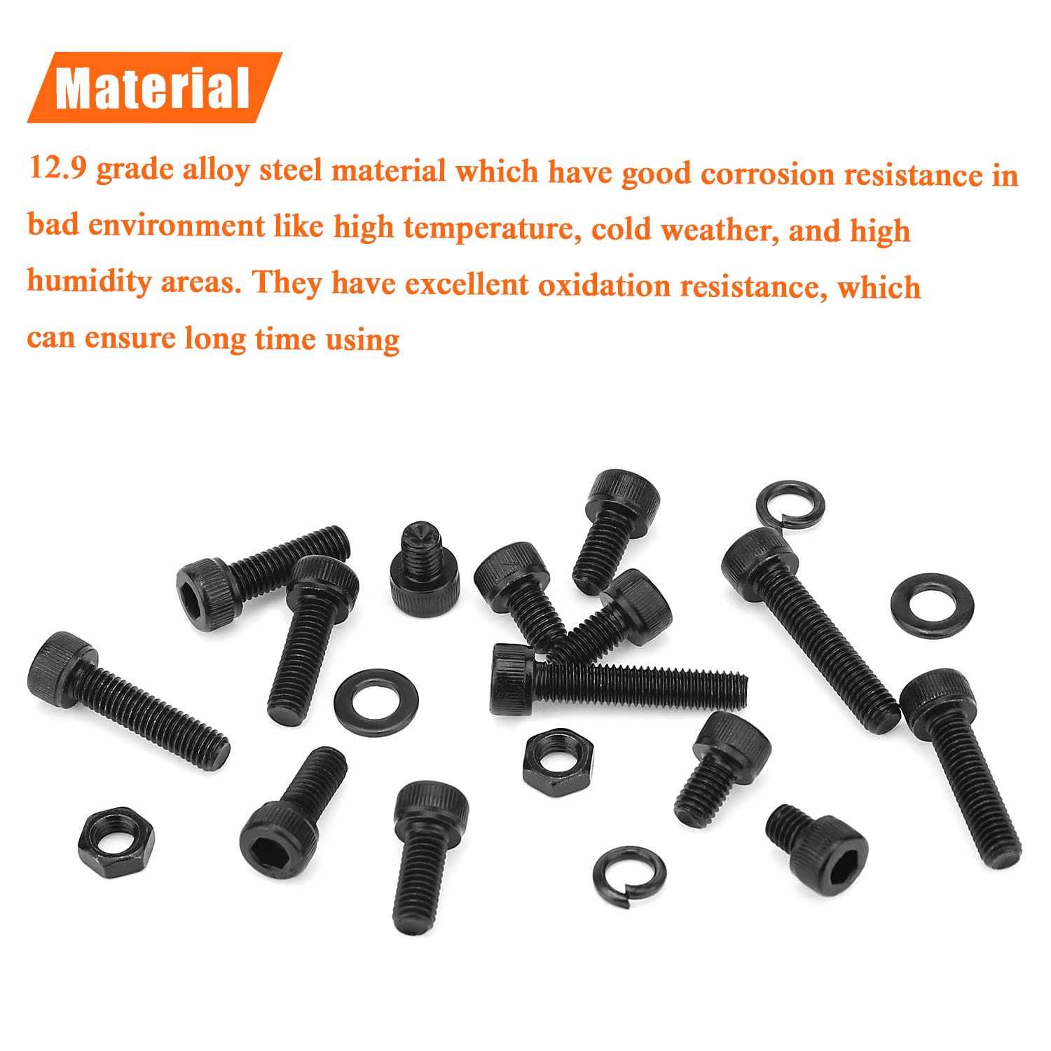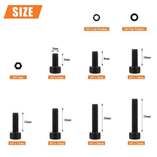 【Sizes】M5 x 6mm /8mm /10mm /12mm /16mm /20mm /25mm hex socket head cap screws with matching hex nuts, lock washers and flat washers, total 7 sizes, different sizes can meet your different needs. 【Material】Made of high quality 12.9 grade alloy steel and the surface is treated with black oxide, high hardness, no deformation, anti-oxidation, wear resistance, corrosion resistance, which can ensure long time using. 【Package】240 pieces in total, packed in a durable transparent box with label. It is easy to distinguish the size of the product, when you want to use a certain screw, you don’t have to waste time buying it separately, you can choose the suitable one to meet all your needs. 【Wide Applications】Widely used in all kinds of precision machinery industry, classified instruments, instruments, electronic products, printed projects, household appliances, communication products, locks, lamps, lights, toys, etc. 【Tips】Products contain small parts, keep away from children and prevent inadvertent swallowed. All screws are special sharp with screw thread, please keep away from kids.