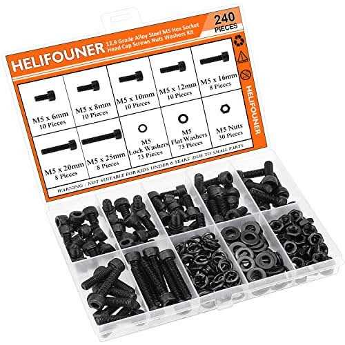 HELIFOUNER 240 Pieces M5 x 6mm /8mm /10mm /12mm /16mm /20mm /25mm, Hex Socket Head Cap Screws Bolts Washers Nuts Kit, 12.9 Grade Alloy Steel, Full