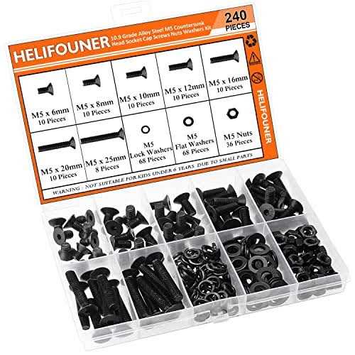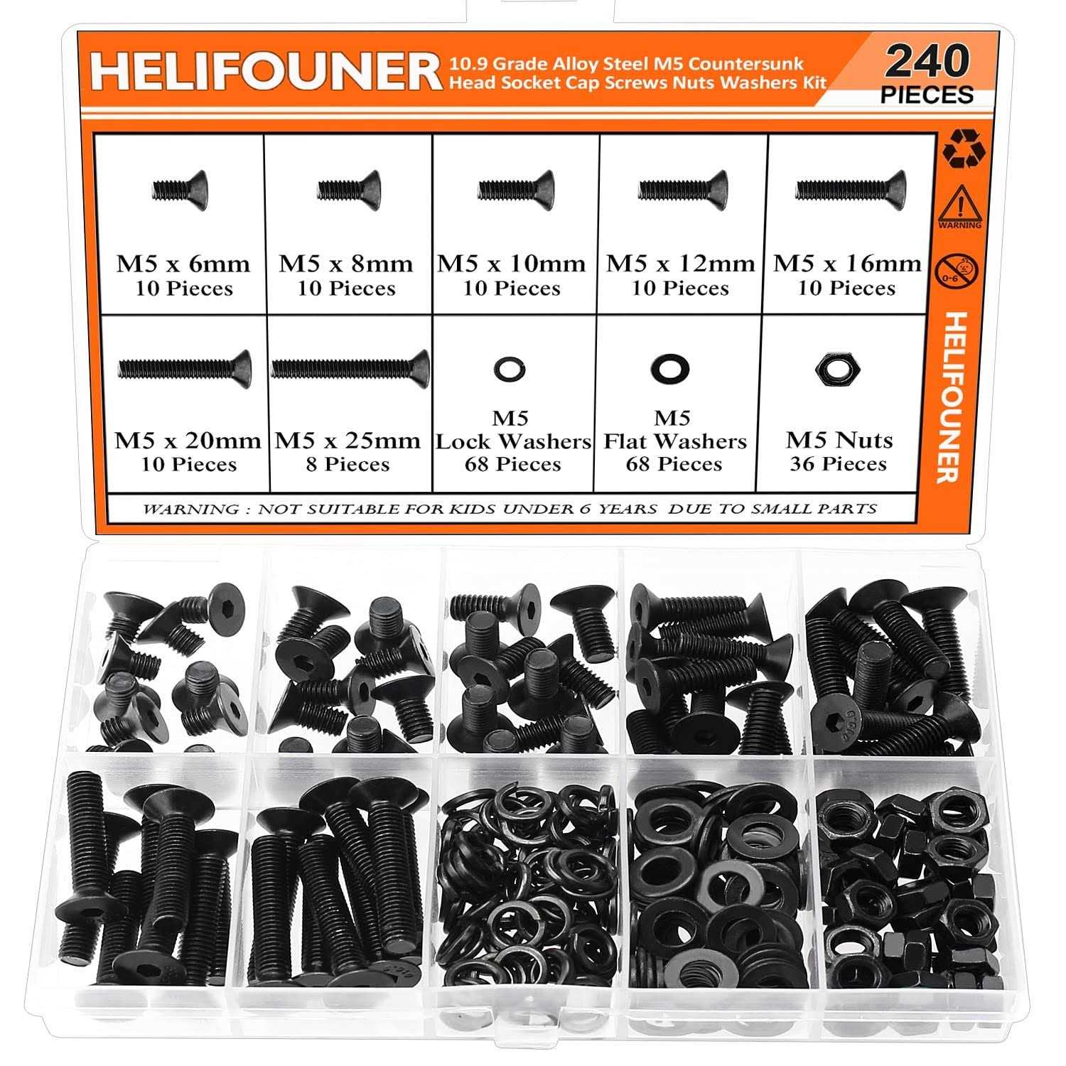 HELIFOUNER 240 Pieces M5 x 6mm /8mm /10mm /12mm /16mm /20mm /25mm, Countersunk Head Socket Cap Screws Bolts Washers Nuts Kit, 10.9 Grade Alloy Steel